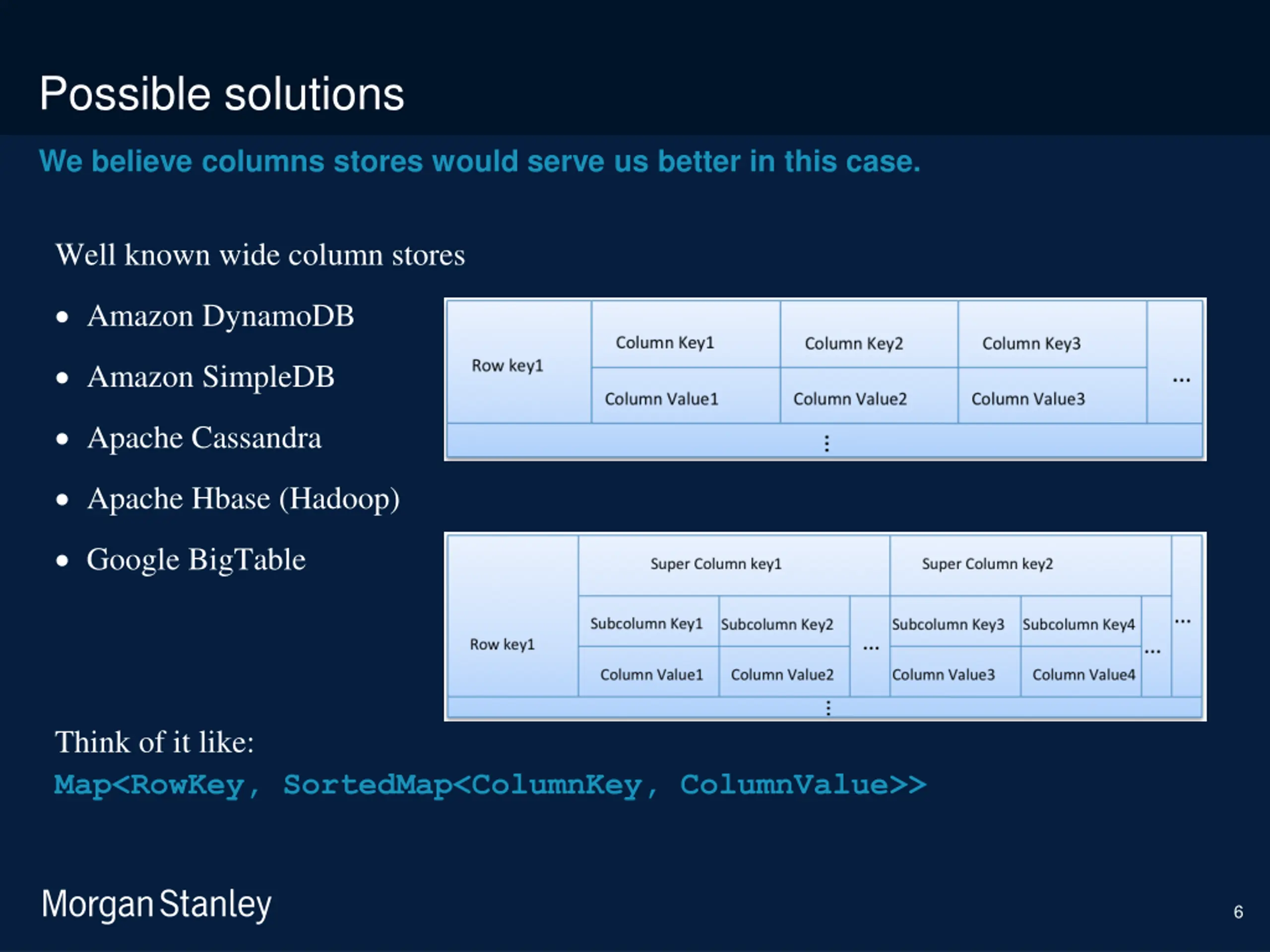 prototype template (5428278)\print library_new_final.ppt 6/5/2025 Possible solutions We believe columns stores would serve us better in this case. Well known wide column stores Amazon DynamoDB Amazon SimpleDB Apache Cassandra Apache Hbase (Hadoop) Google BigTable Think of it like: Map<RowKey, SortedMap<ColumnKey, ColumnValue>> 6