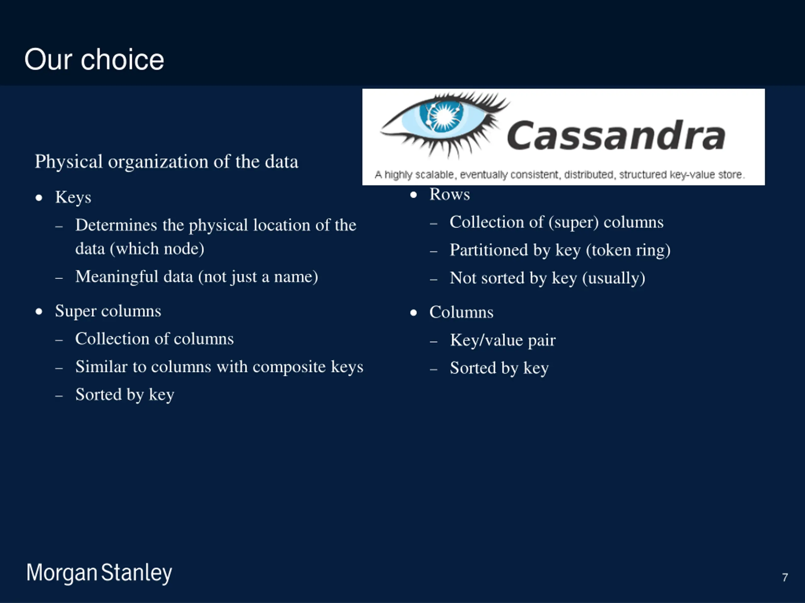 prototype template (5428278)\print library_new_final.ppt 6/5/2025 Our choice Physical organization of the data Rows Keys Collection of (super) columns Determines the physical location of the data (which node) Partitioned by key (token ring) Meaningful data (not just a name) Not sorted by key (usually) Super columns Columns Collection of columns Key/value pair Similar to columns with composite keys Sorted by key Sorted by key 7