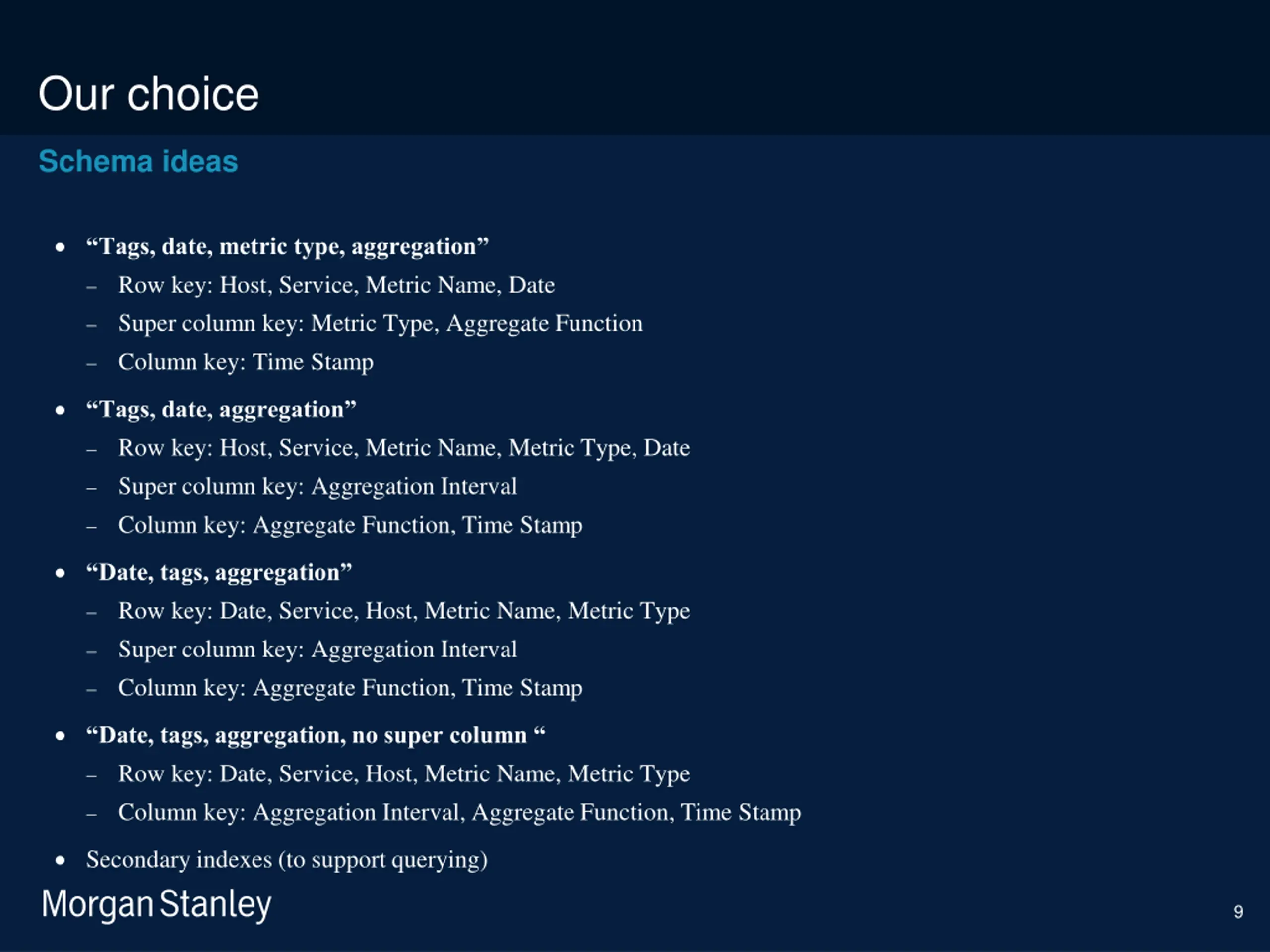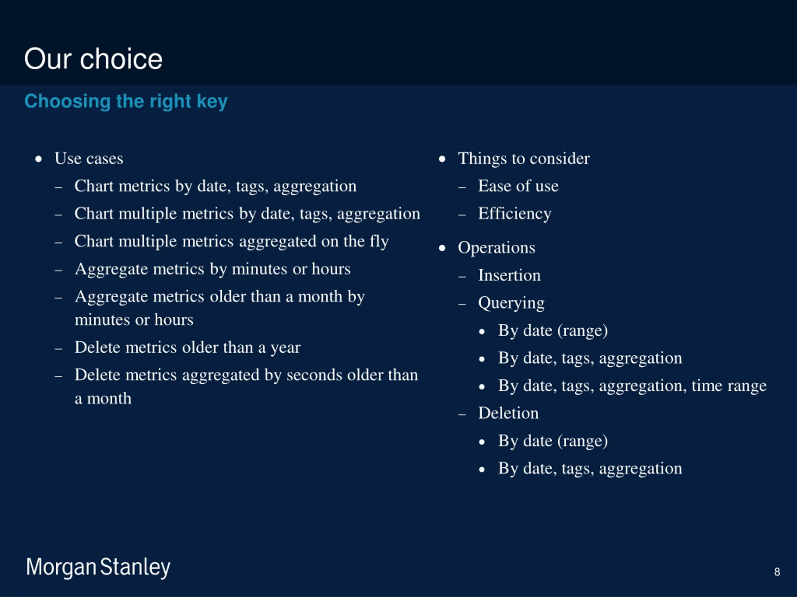 prototype template (5428278)\print library_new_final.ppt 6/5/2025 Our choice Choosing the right key Use cases Things to consider Chart metrics by date, tags, aggregation Ease of use Chart multiple metrics by date, tags, aggregation Efficiency Chart multiple metrics aggregated on the fly Operations Aggregate metrics by minutes or hours Insertion Aggregate metrics older than a month by minutes or hours Querying By date (range) Delete metrics older than a year By date, tags, aggregation Delete metrics aggregated by seconds older than a month By date, tags, aggregation, time range Deletion By date (range) By date, tags, aggregation 8