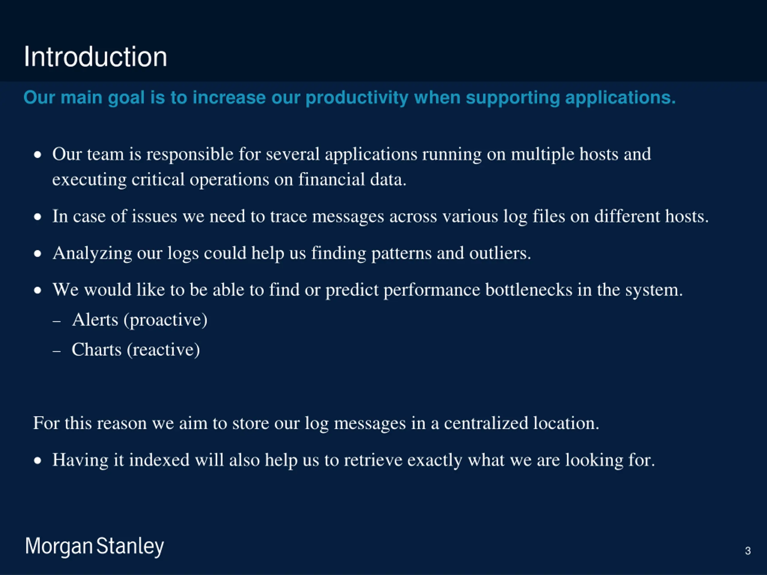 prototype template (5428278)\print library_new_final.ppt 6/5/2025 Introduction Our main goal is to increase our productivity when supporting applications. Our team is responsible for several applications running on multiple hosts and executing critical operations on financial data. In case of issues we need to trace messages across various log files on different hosts. Analyzing our logs could help us finding patterns and outliers. We would like to be able to find or predict performance bottlenecks in the system. Alerts (proactive) Charts (reactive) For this reason we aim to store our log messages in a centralized location. Having it indexed will also help us to retrieve exactly what we are looking for. 3