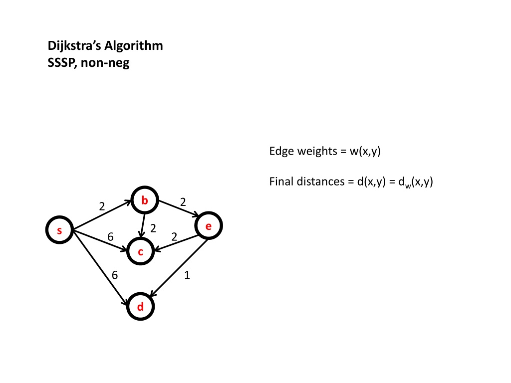 Dijkstras Algorithm SSSP, non-neg Edge weights = w(x,y) Final distances = d(x,y) = dw(x,y) b 2 2 e 2 s 6 2 c 6 1 d