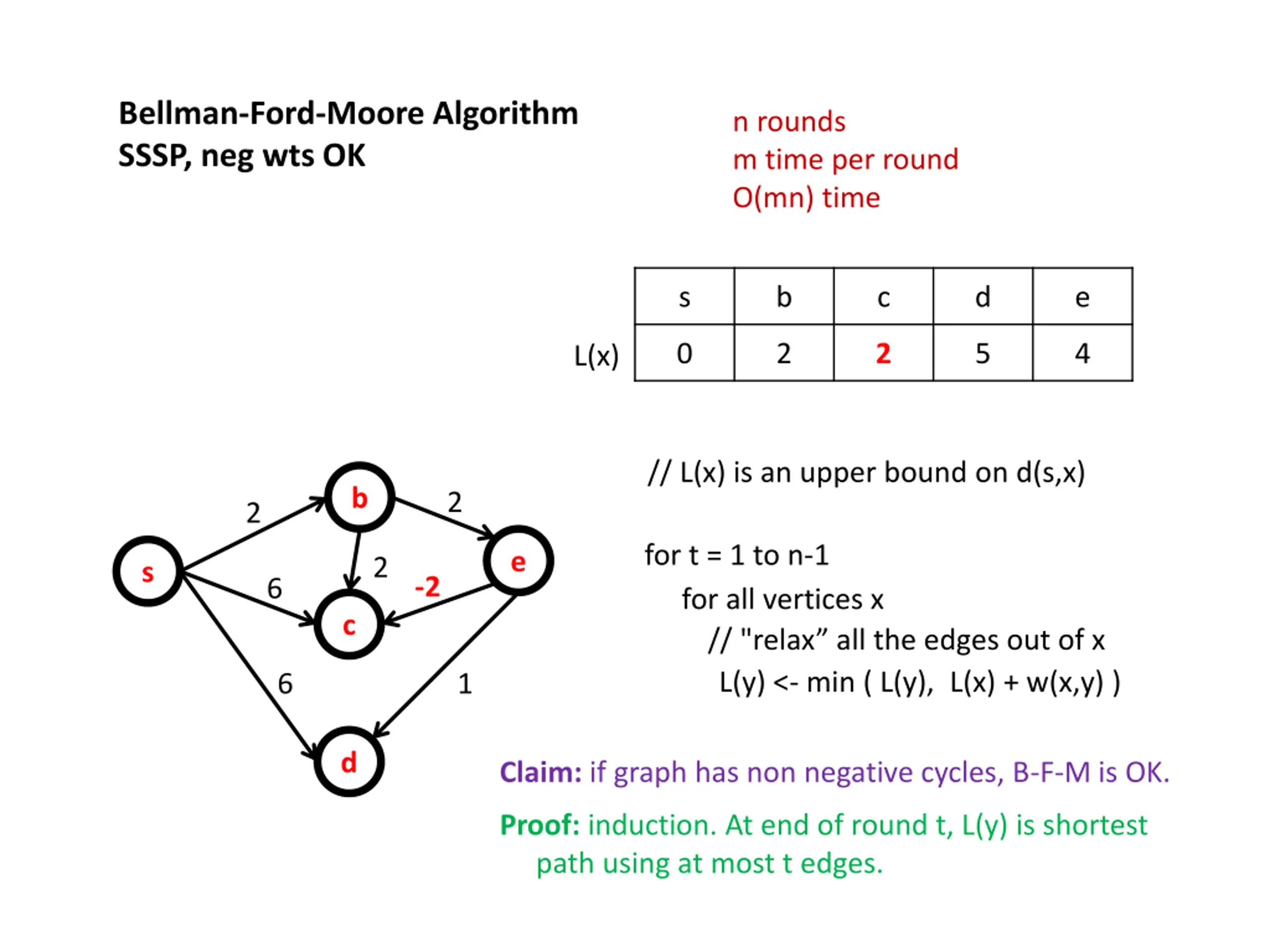 Bellman-Ford-Moore Algorithm SSSP, neg wts OK n rounds m time per round O(mn) time s b c d e 0 2 2 5 4 L(x) // L(x) is an upper bound on d(s,x) b 2 2 for t = 1 to n-1 for all vertices x e 2 s -2 6 c // "relax all the edges out of x L(y) <- min ( L(y), L(x) + w(x,y) ) 6 1 d Claim: if graph has non negative cycles, B-F-M is OK. Proof: induction. At end of round t, L(y) is shortest path using at most t edges.