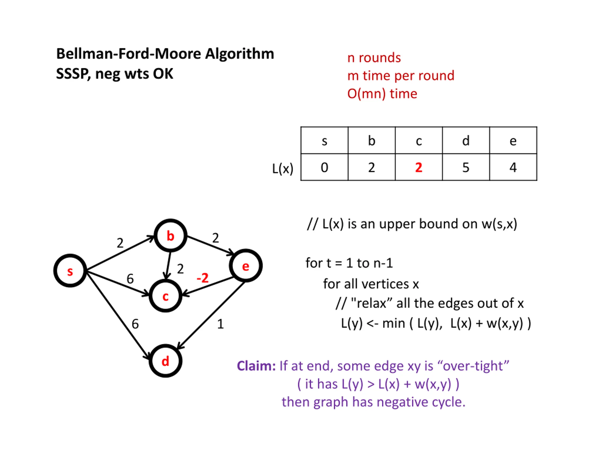 Bellman-Ford-Moore Algorithm SSSP, neg wts OK n rounds m time per round O(mn) time s b c d e 0 2 2 5 4 L(x) // L(x) is an upper bound on w(s,x) b 2 2 for t = 1 to n-1 for all vertices x e 2 s -2 6 c // "relax all the edges out of x L(y) <- min ( L(y), L(x) + w(x,y) ) 6 1 d Claim: If at end, some edge xy is over-tight ( it has L(y) > L(x) + w(x,y) ) then graph has negative cycle.