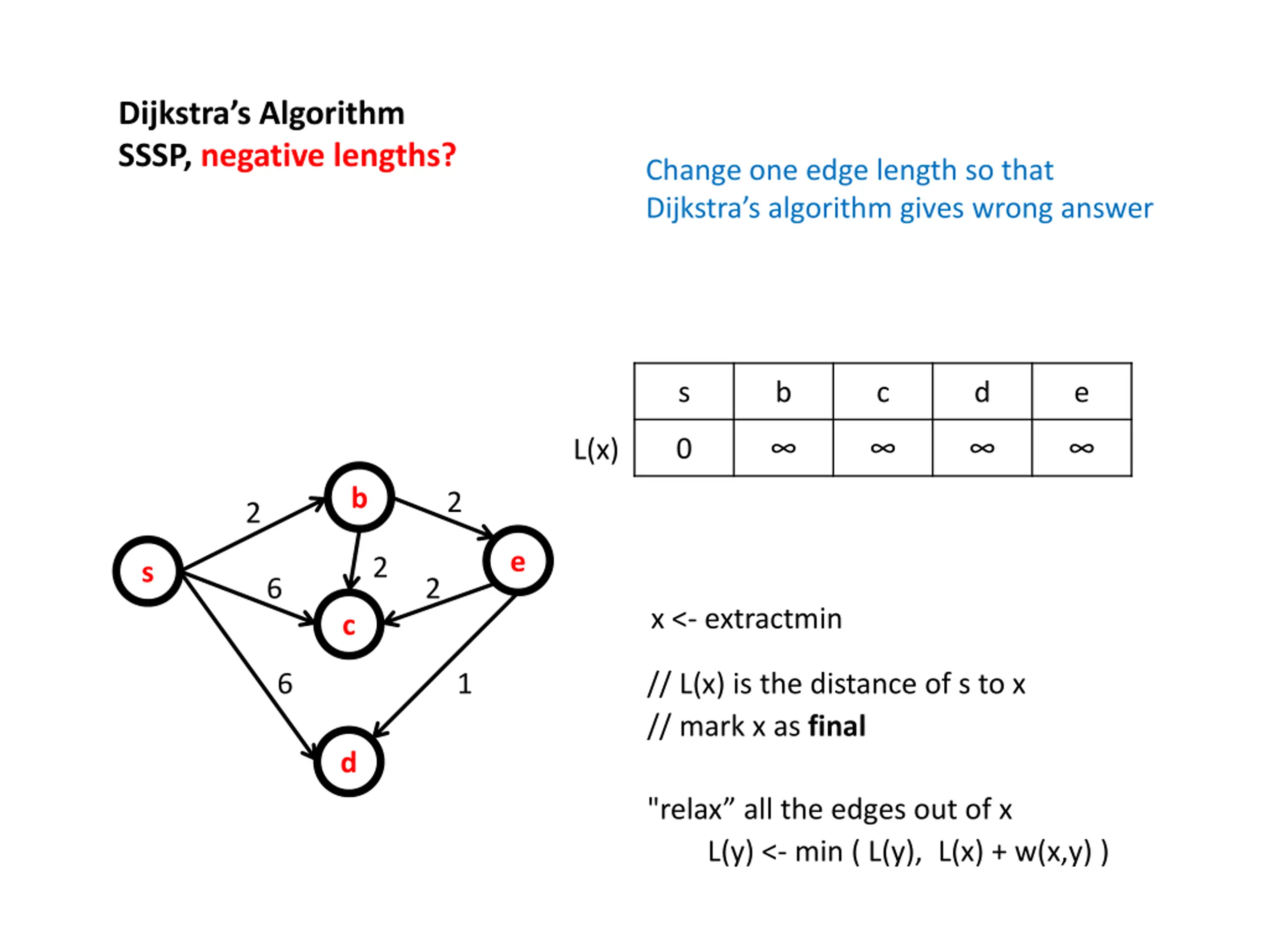 Dijkstras Algorithm SSSP, negative lengths? Change one edge length so that Dijkstra s algorithm gives wrong answer s b c d e 0 L(x) b 2 2 e 2 s 6 2 x <- extractmin c 6 1 // L(x) is the distance of s to x // mark x as final d "relax all the edges out of x L(y) <- min ( L(y), L(x) + w(x,y) )