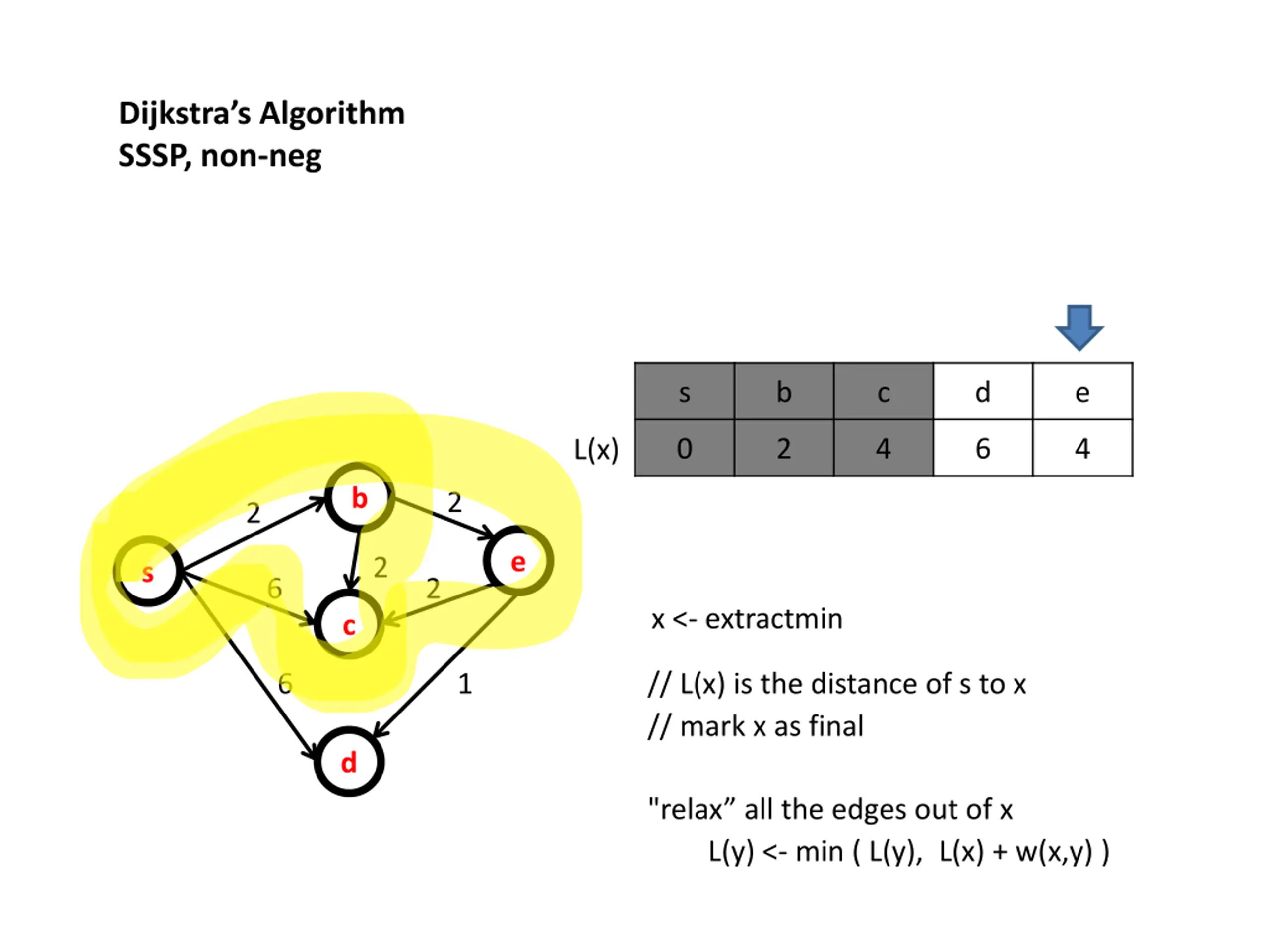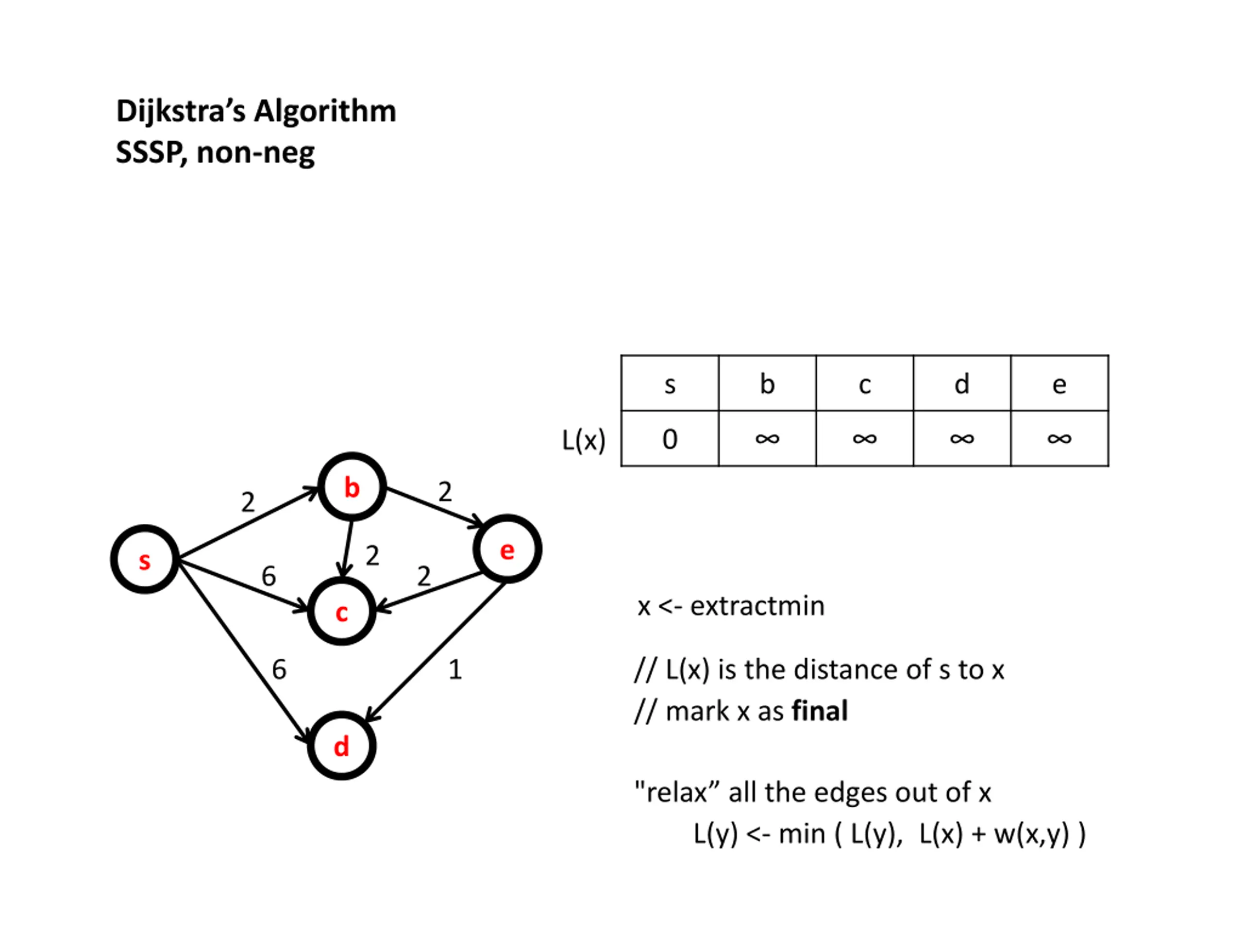 Dijkstras Algorithm SSSP, non-neg s b c d e 0 2 6 6 L(x) b 2 2 e 2 s 6 2 x <- extractmin c 6 1 // L(x) is the distance of s to x // mark x as final d "relax all the edges out of x L(y) <- min ( L(y), L(x) + w(x,y) )