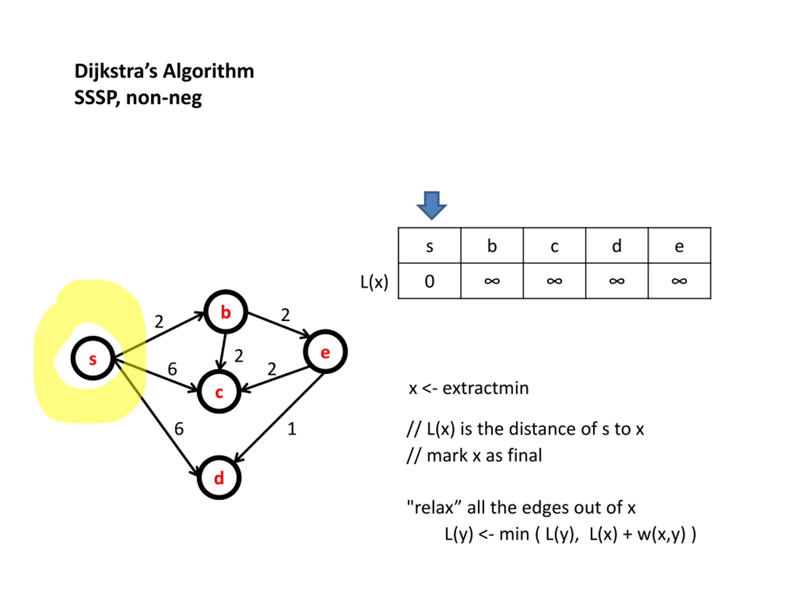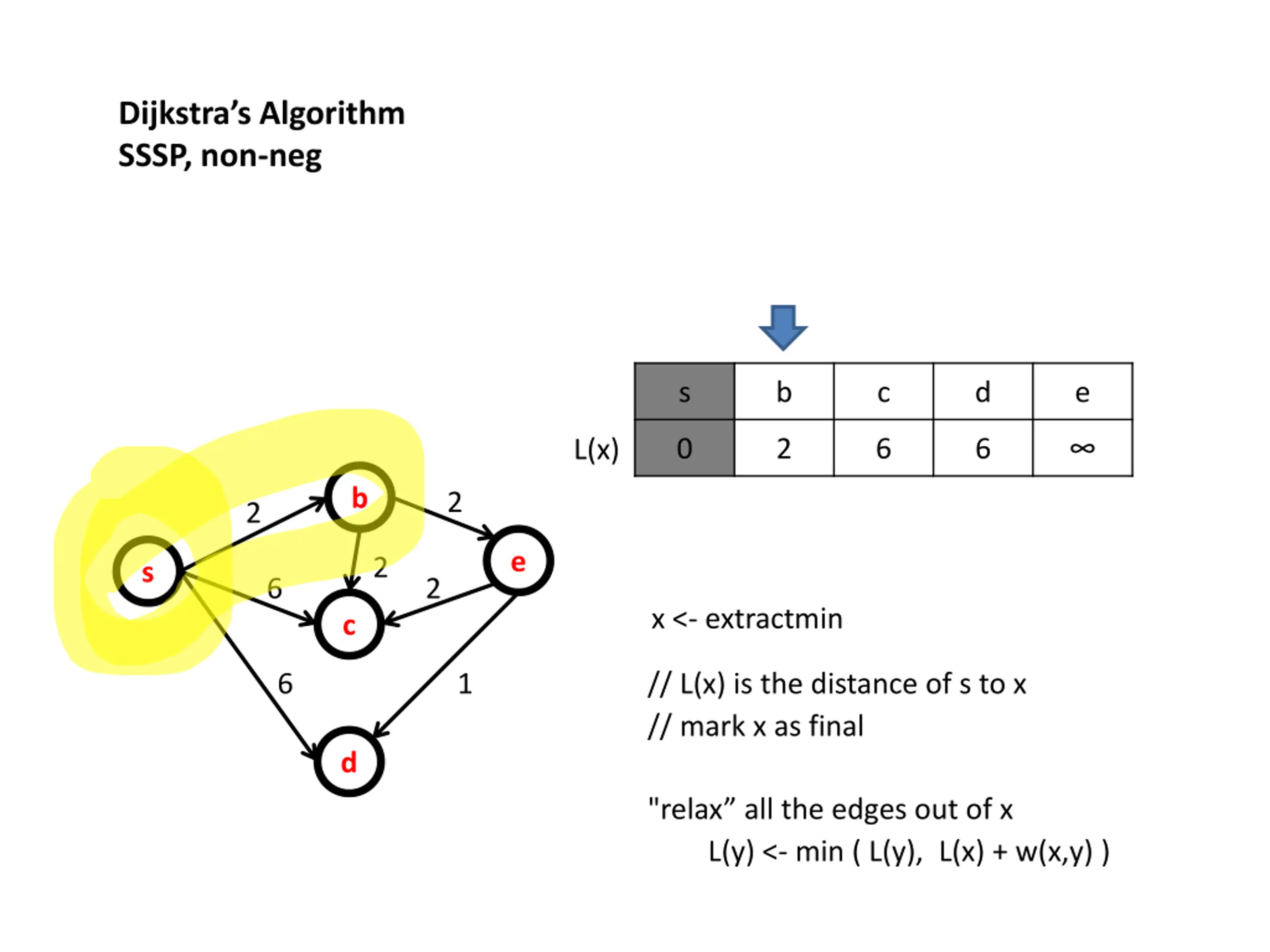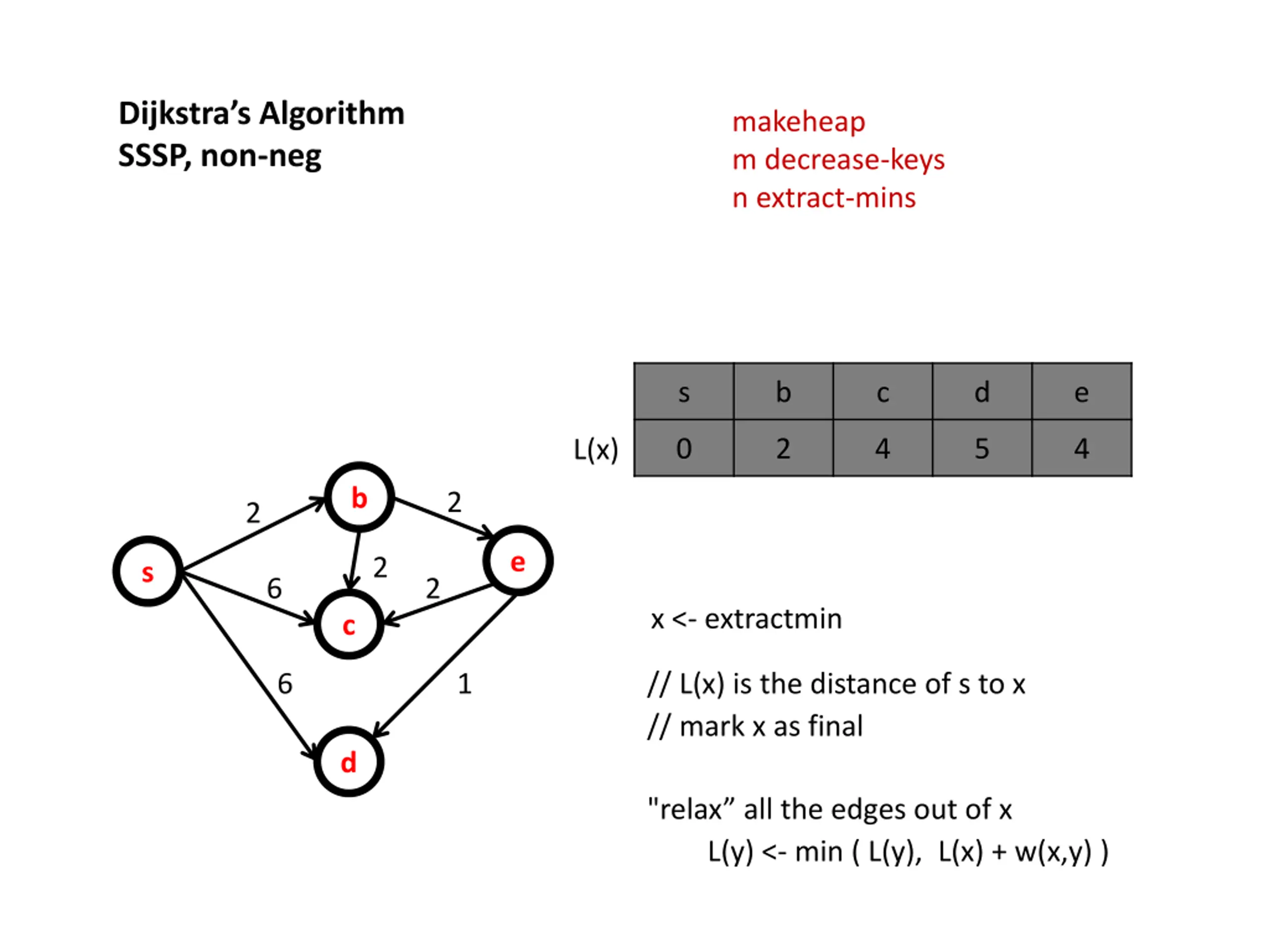 Dijkstras Algorithm SSSP, non-neg s b c d e 0 L(x) b 2 2 e 2 s 6 2 x <- extractmin c 6 1 // L(x) is the distance of s to x // mark x as final d "relax all the edges out of x L(y) <- min ( L(y), L(x) + w(x,y) )