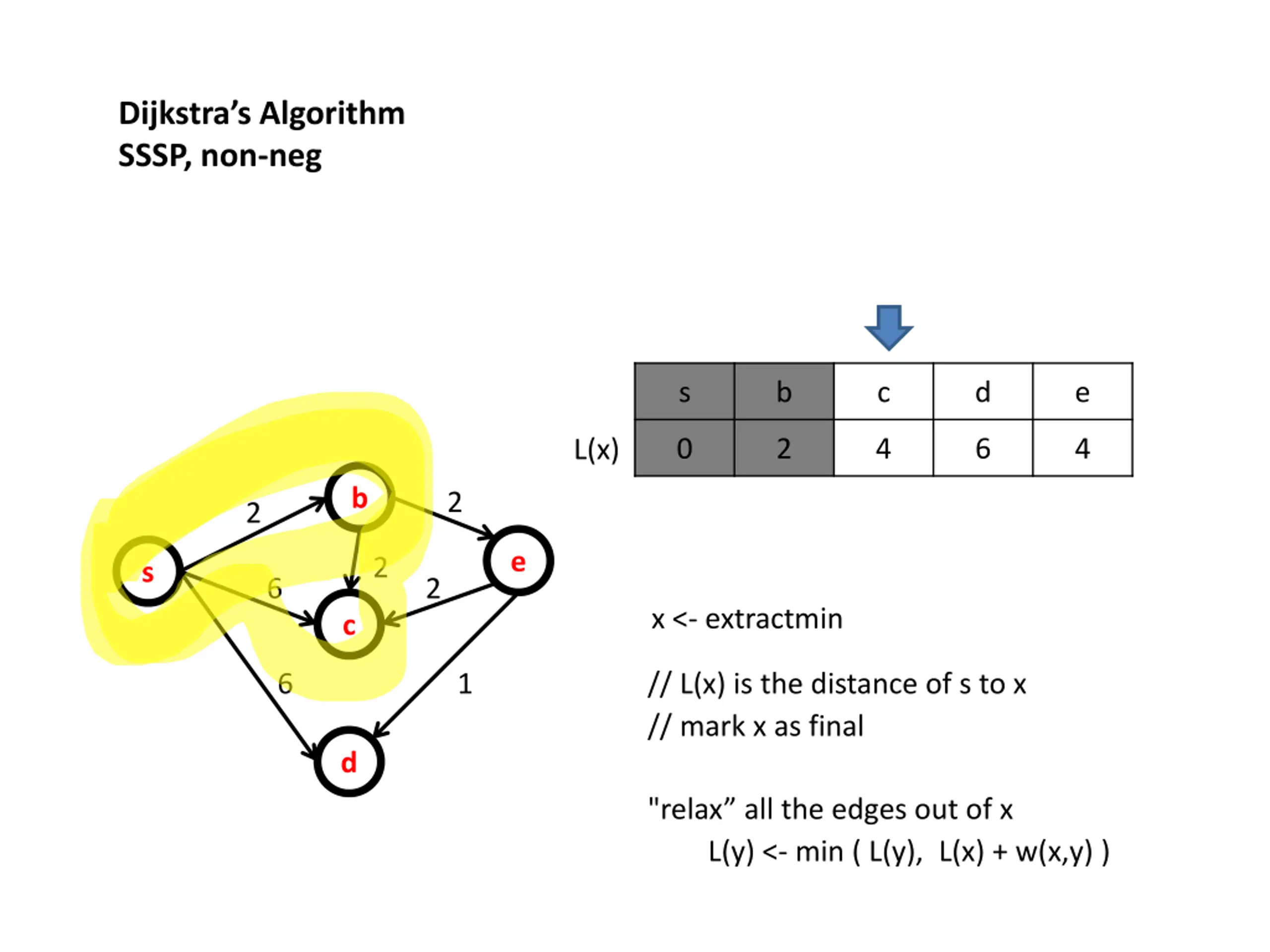Dijkstras Algorithm SSSP, non-neg s b c d e 0 2 4 5 4 L(x) b 2 2 e 2 s 6 2 x <- extractmin c 6 1 // L(x) is the distance of s to x // mark x as final d "relax all the edges out of x L(y) <- min ( L(y), L(x) + w(x,y) )