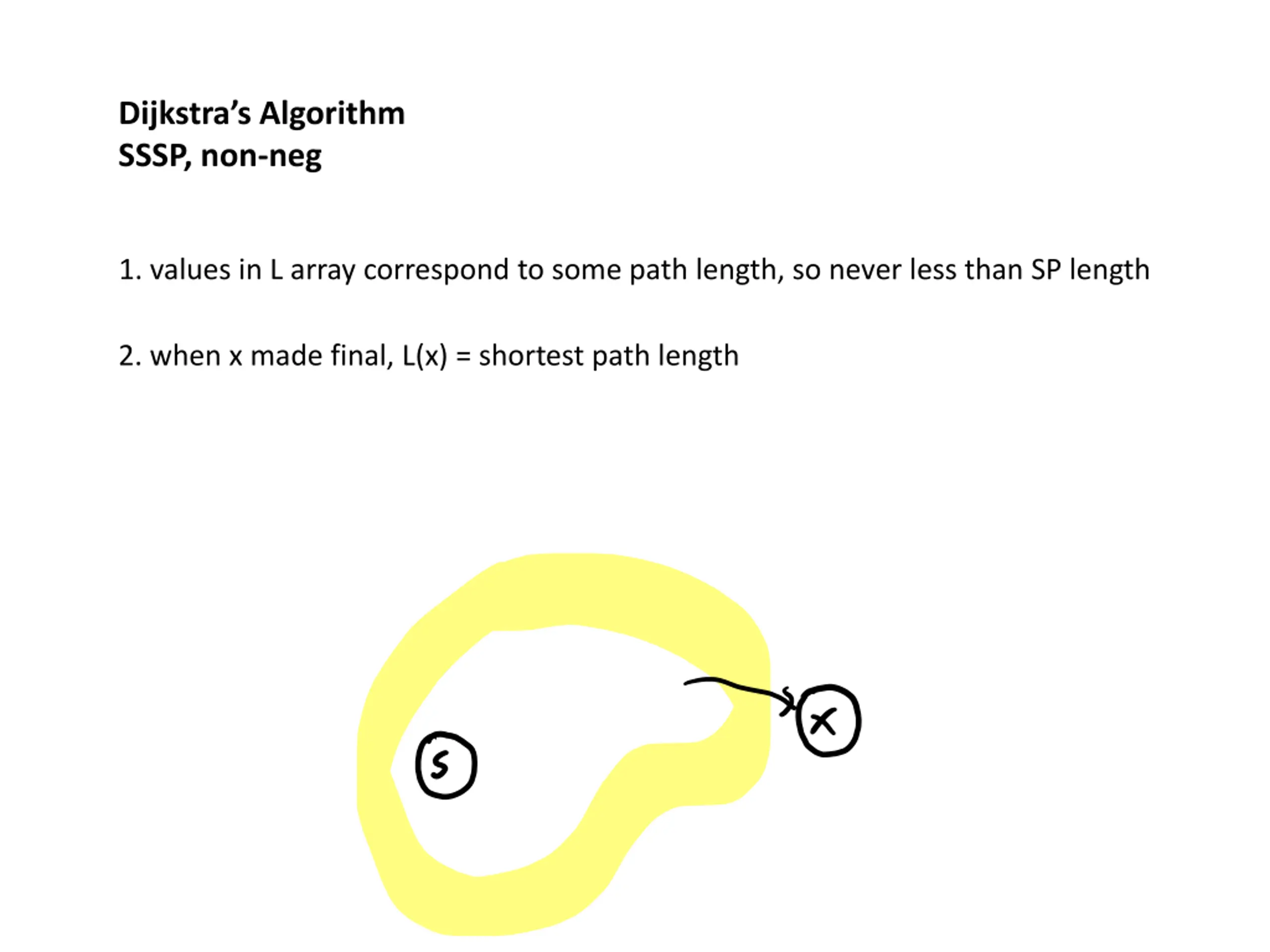 Dijkstras Algorithm SSSP, non-neg 1. values in L array correspond to some path length, so never less than SP length 2. when x made final, L(x) = shortest path length