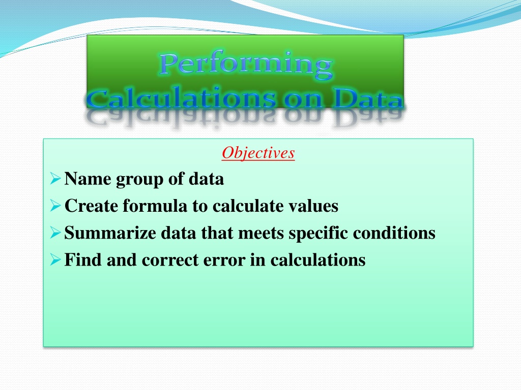 Objectives Name group of data Create formula to calculate values Summarize data that meets specific conditions Find and correct error in calculations