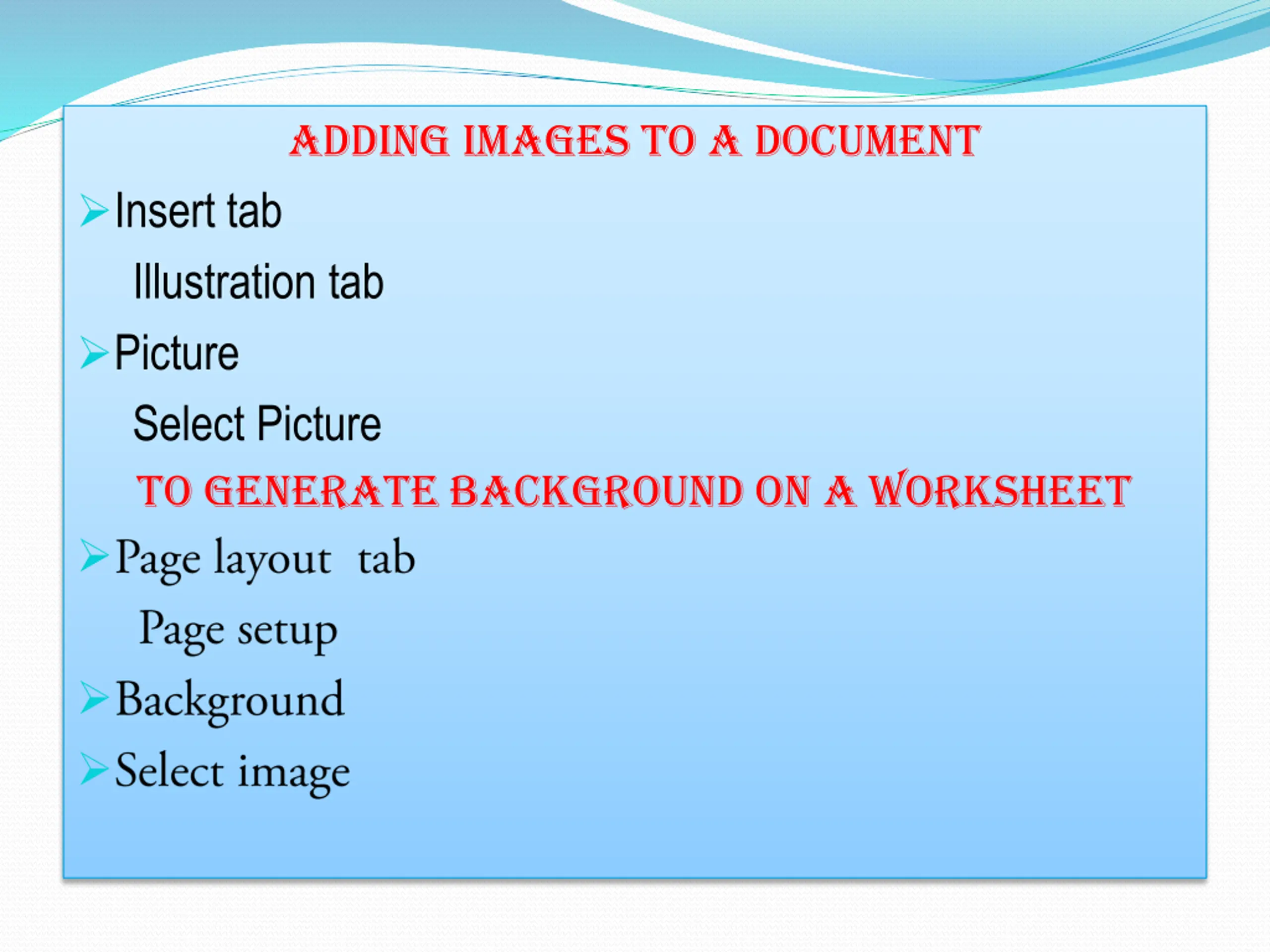 Adding Images to a document Insert tab Illustration tab Picture Select Picture To generate background on a worksheet