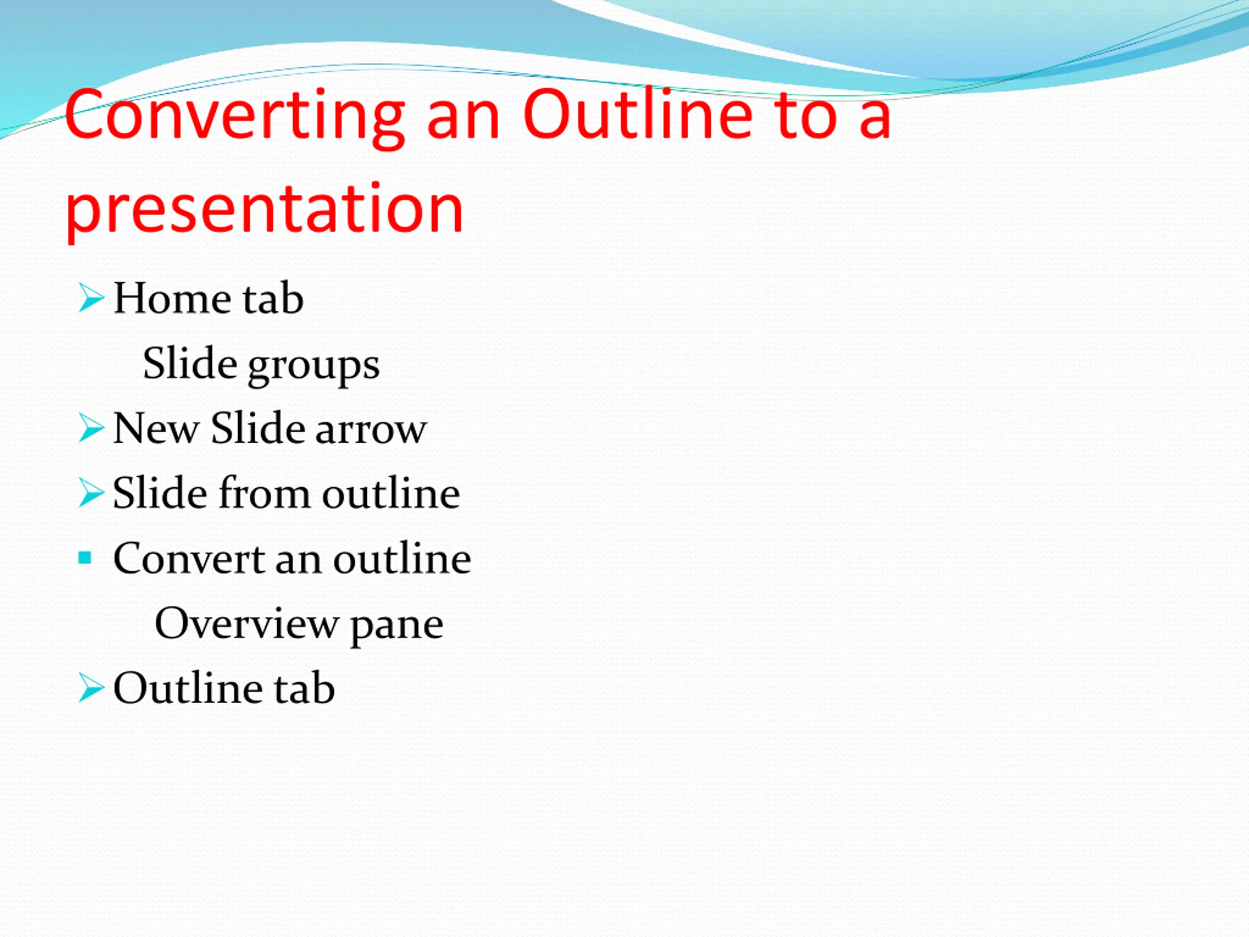 Converting an Outline to a presentation Home tab Slide groups New Slide arrow Slide from outline Convert an outline Overview pane Outline tab