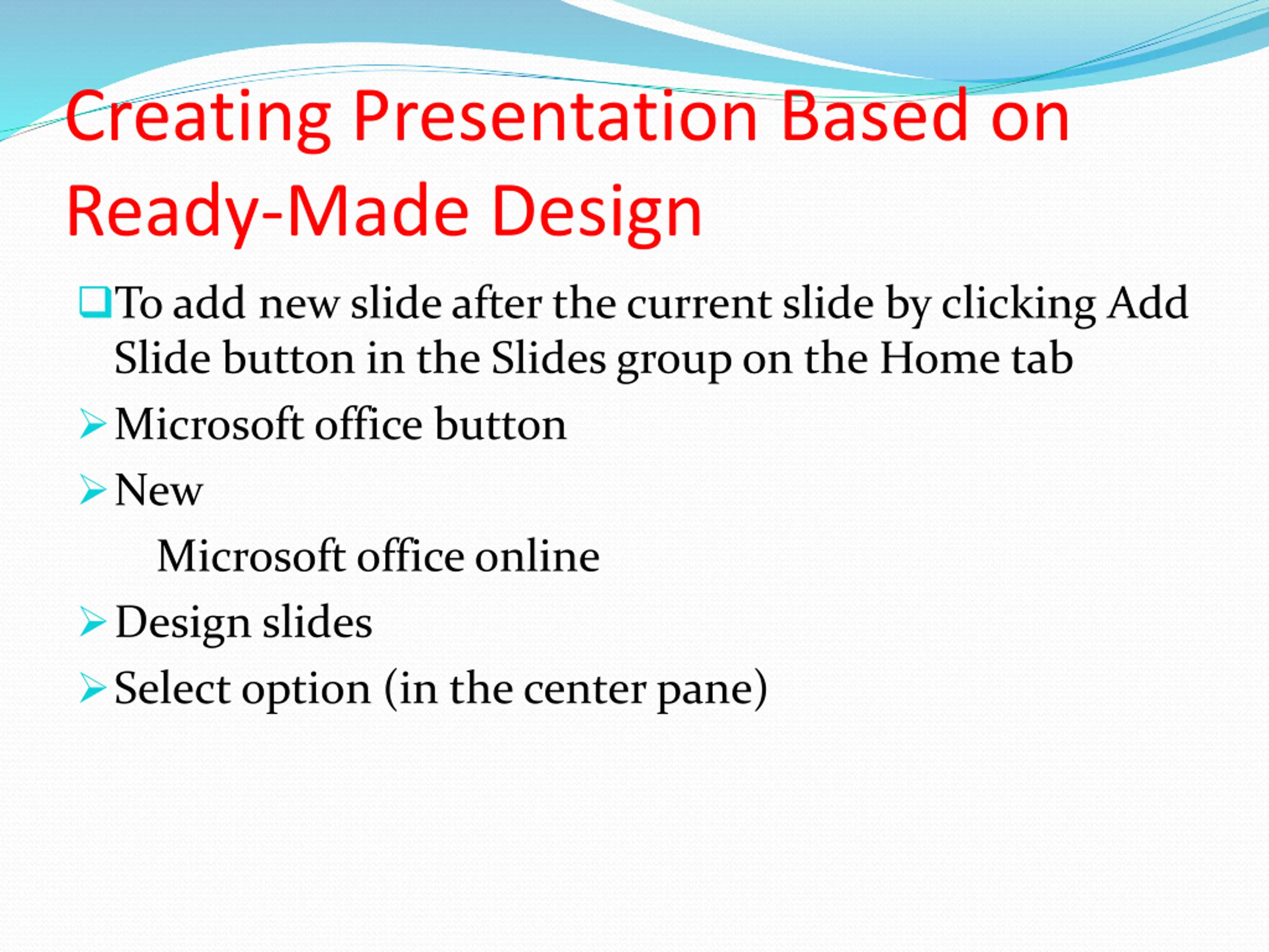 Creating Presentation Based on Ready-Made Design To add new slide after the current slide by clicking Add Slide button in the Slides group on the Home tab Microsoft office button New Microsoft office online Design slides Select option (in the center pane)