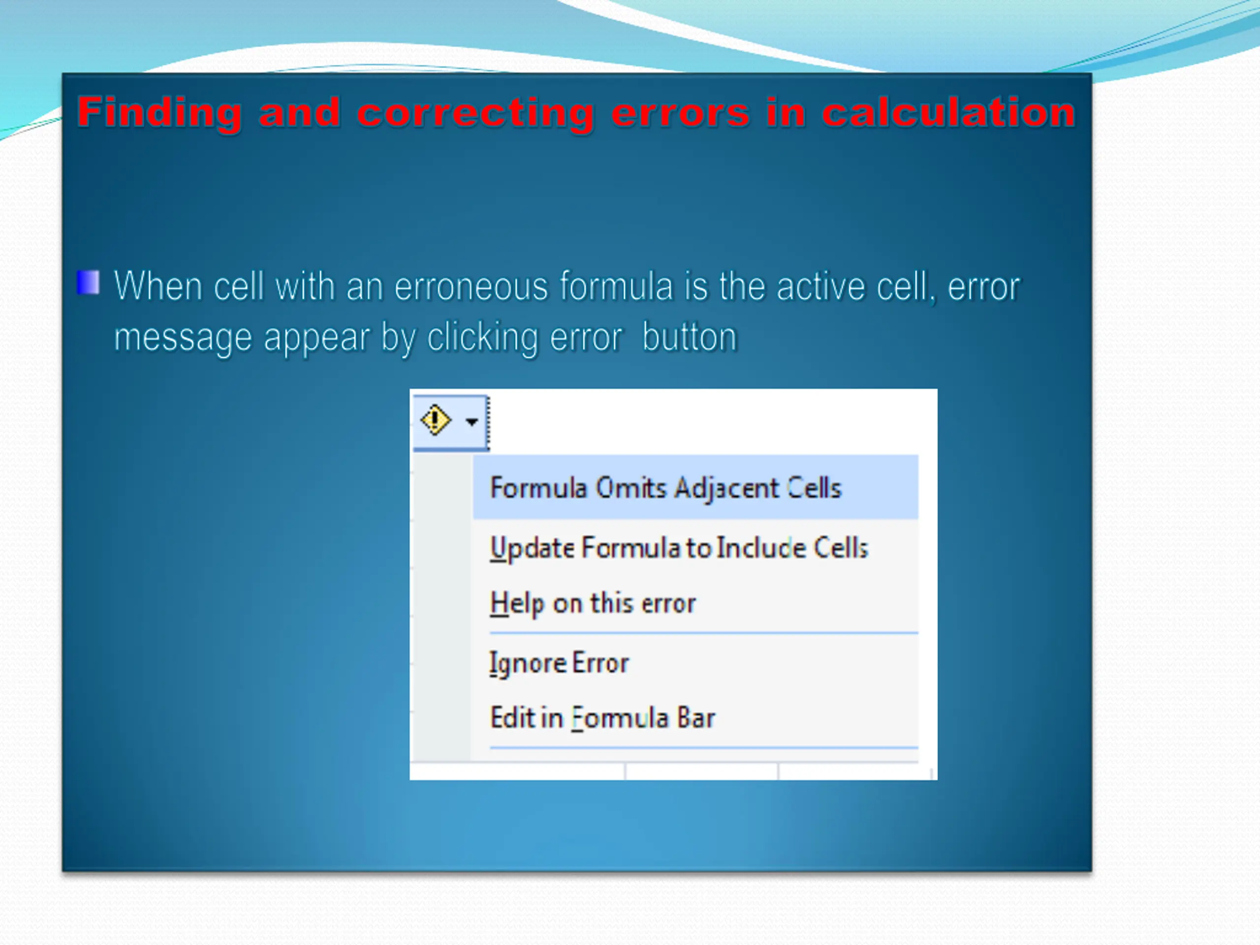 Finding and correcting errors in calculation Finding and correcting errors in calculation When cell with an erroneous formula is the active cell, error message appear by clicking error button