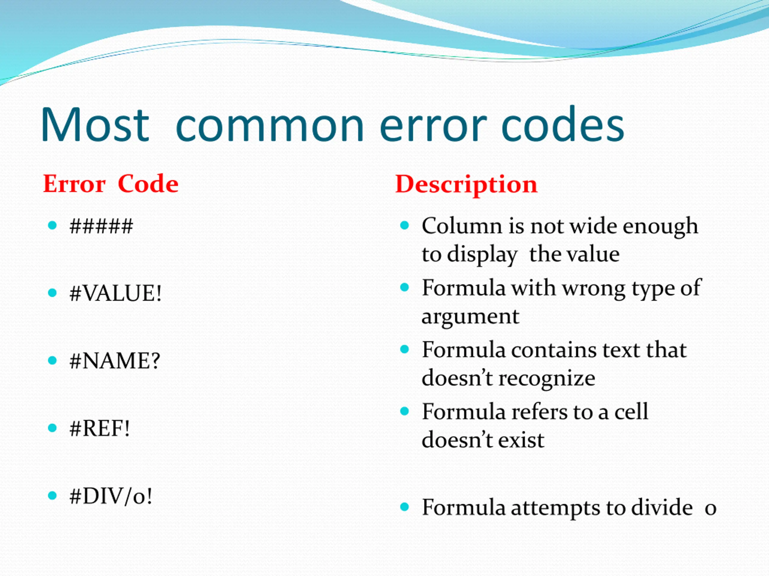 Most common error codes Error Code Description ##### Column is not wide enough to display the value Formula with wrong type of argument Formula contains text that doesn t recognize Formula refers to a cell doesn t exist #VALUE! #NAME? #REF! #DIV/0! Formula attempts to divide 0
