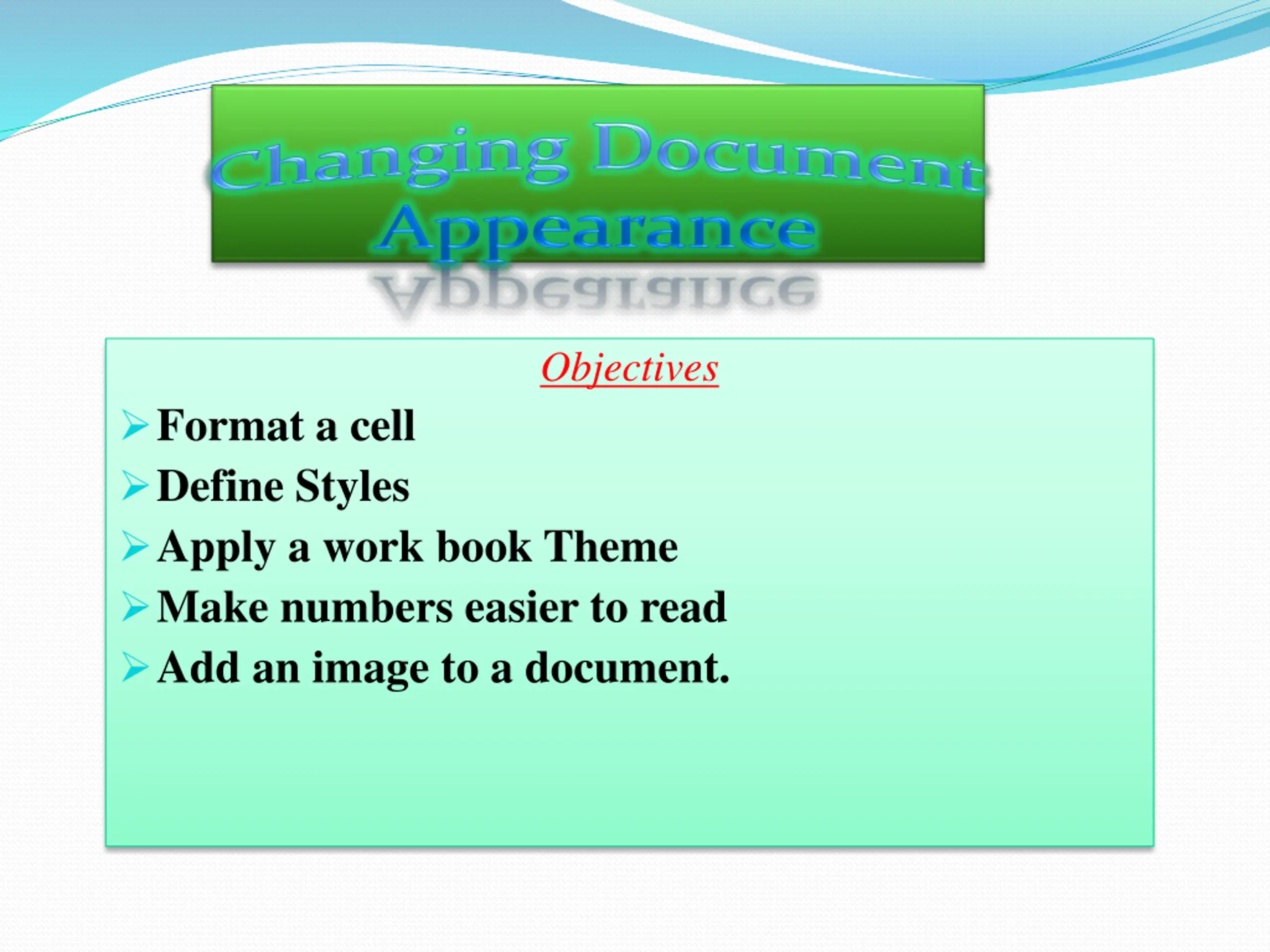 Objectives Format a cell Define Styles Apply a work book Theme Make numbers easier to read Add an image to a document.