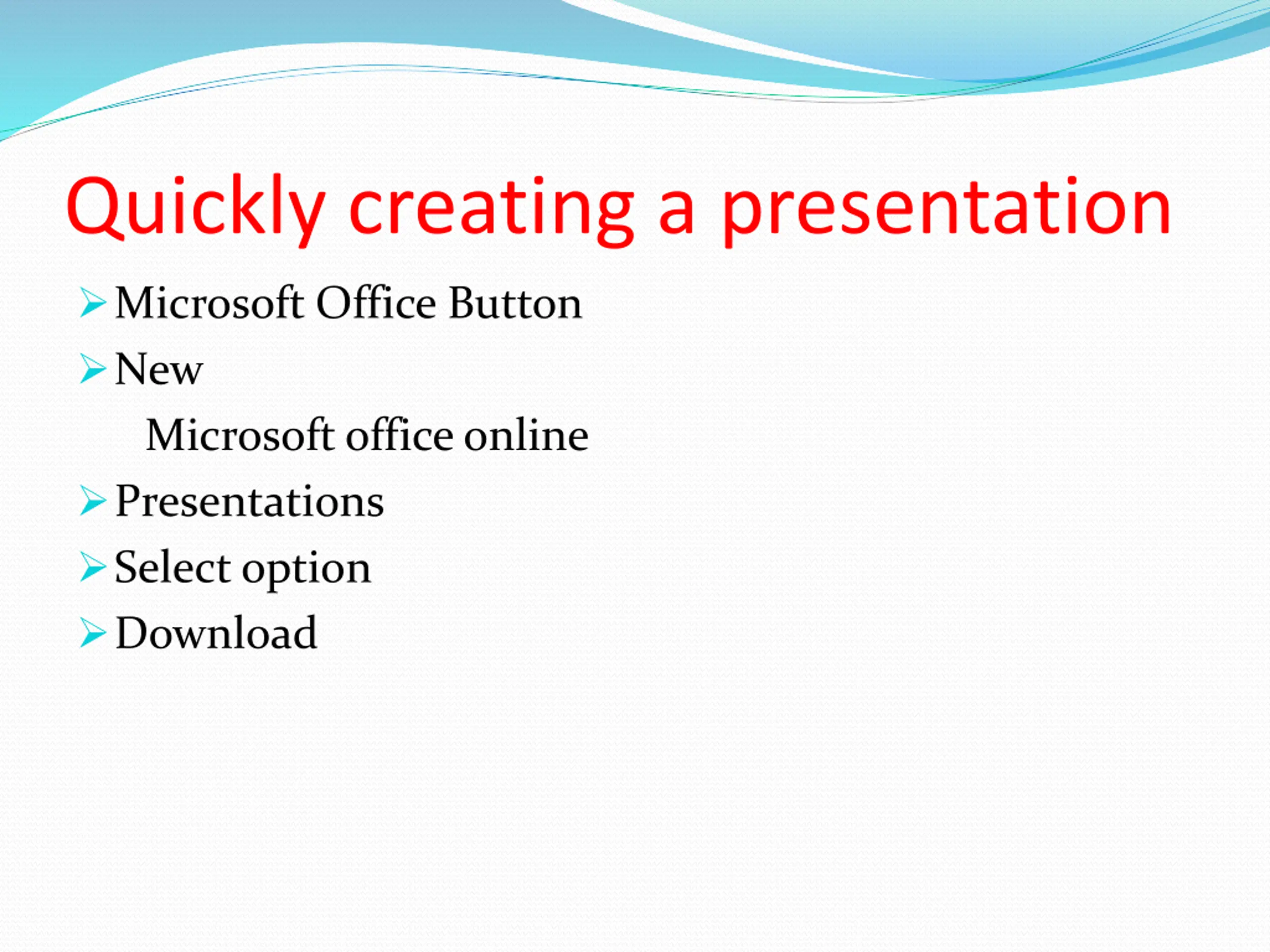 Quickly creating a presentation Microsoft Office Button New Microsoft office online Presentations Select option Download