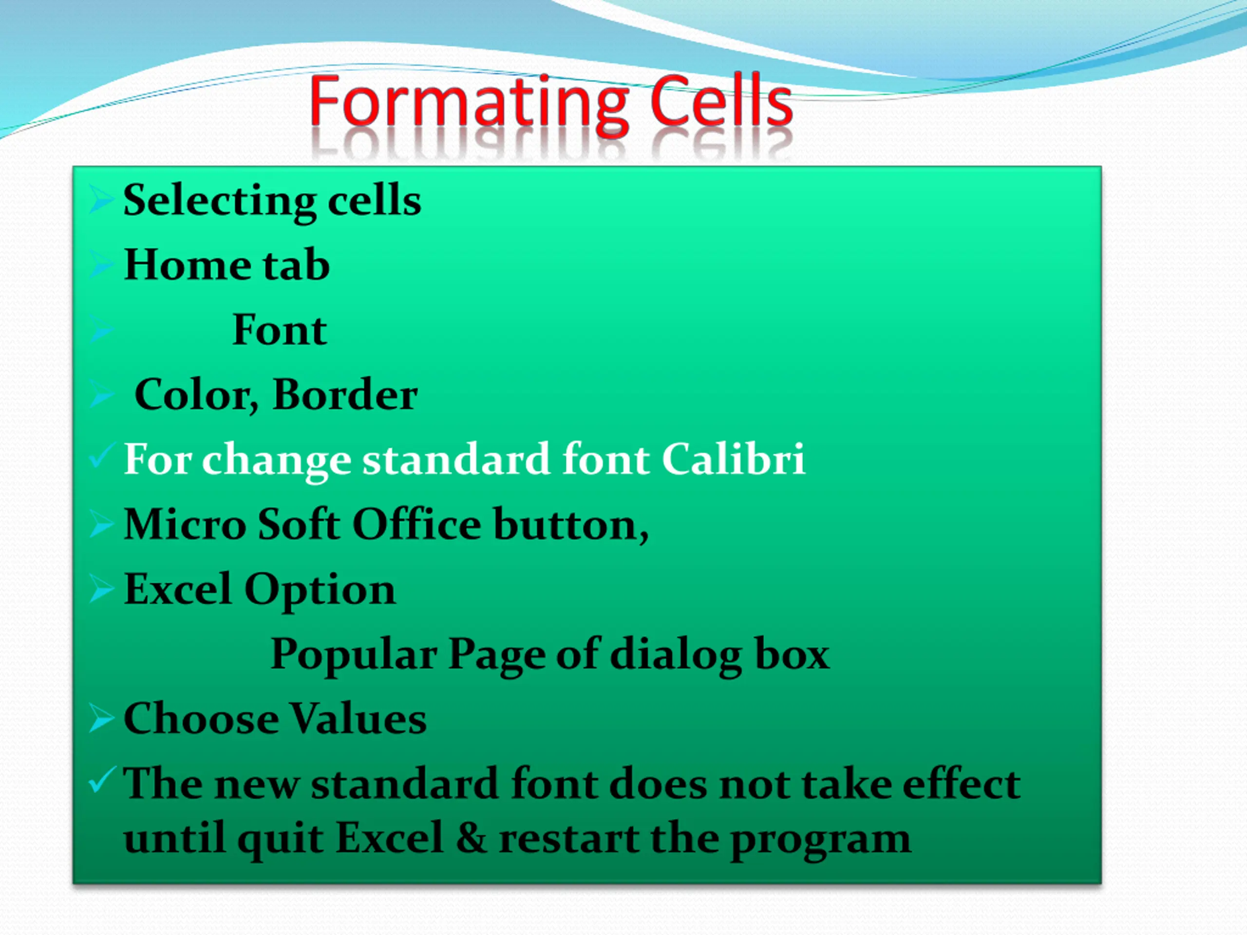 Selecting cells Home tab Font Color, Border For change standard font Calibri Micro Soft Office button, Excel Option Popular Page of dialog box Choose Values The new standard font does not take effect until quit Excel & restart the program