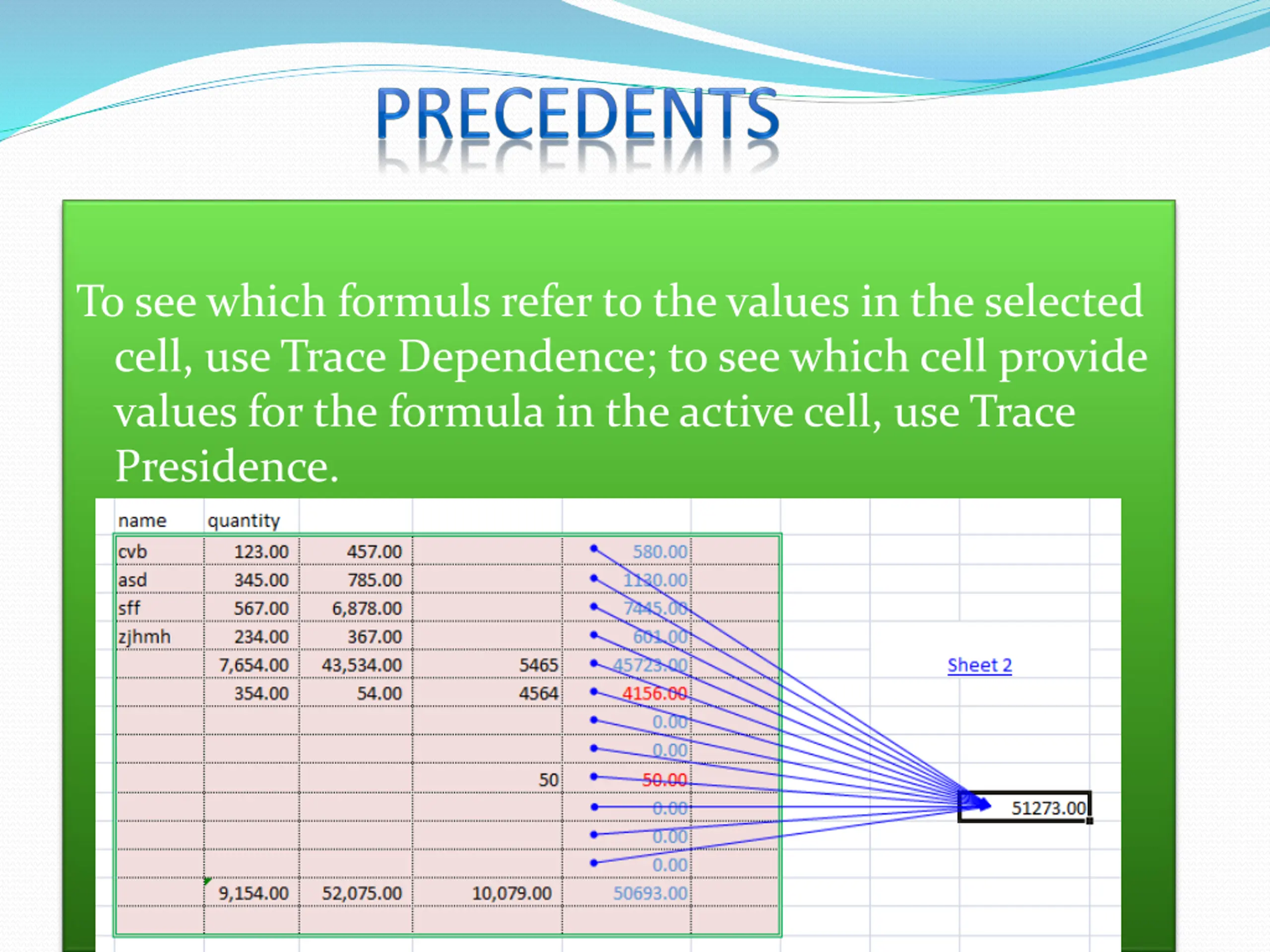 To see which formuls refer to the values in the selected cell, use Trace Dependence; to see which cell provide values for the formula in the active cell, use Trace Presidence.