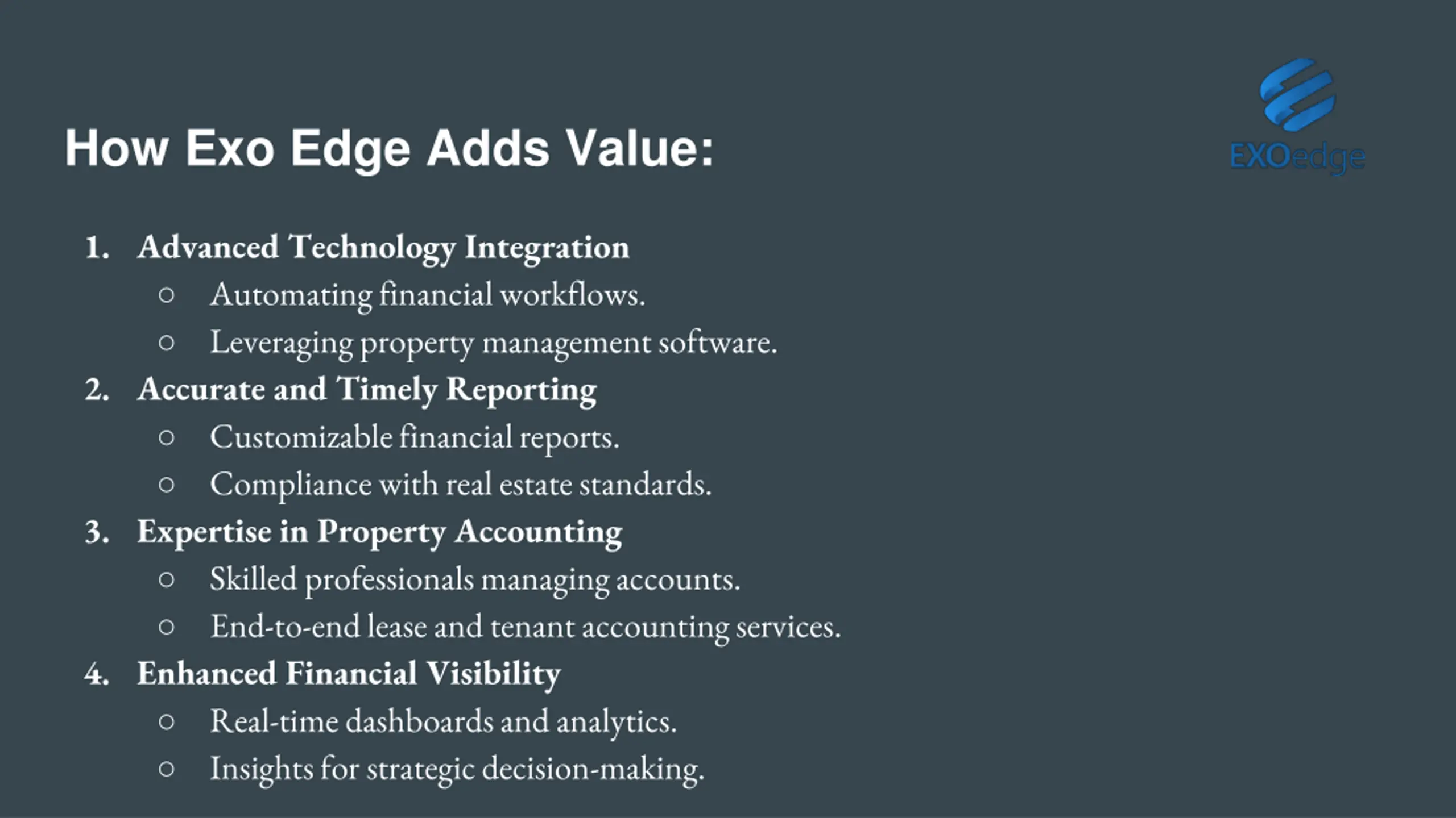 This presentation highlights how Exo Edge streamlines property management accounting through automation, expert services, and real-time insights, helping real estate firms achieve efficiency, compliance, and cost savings.