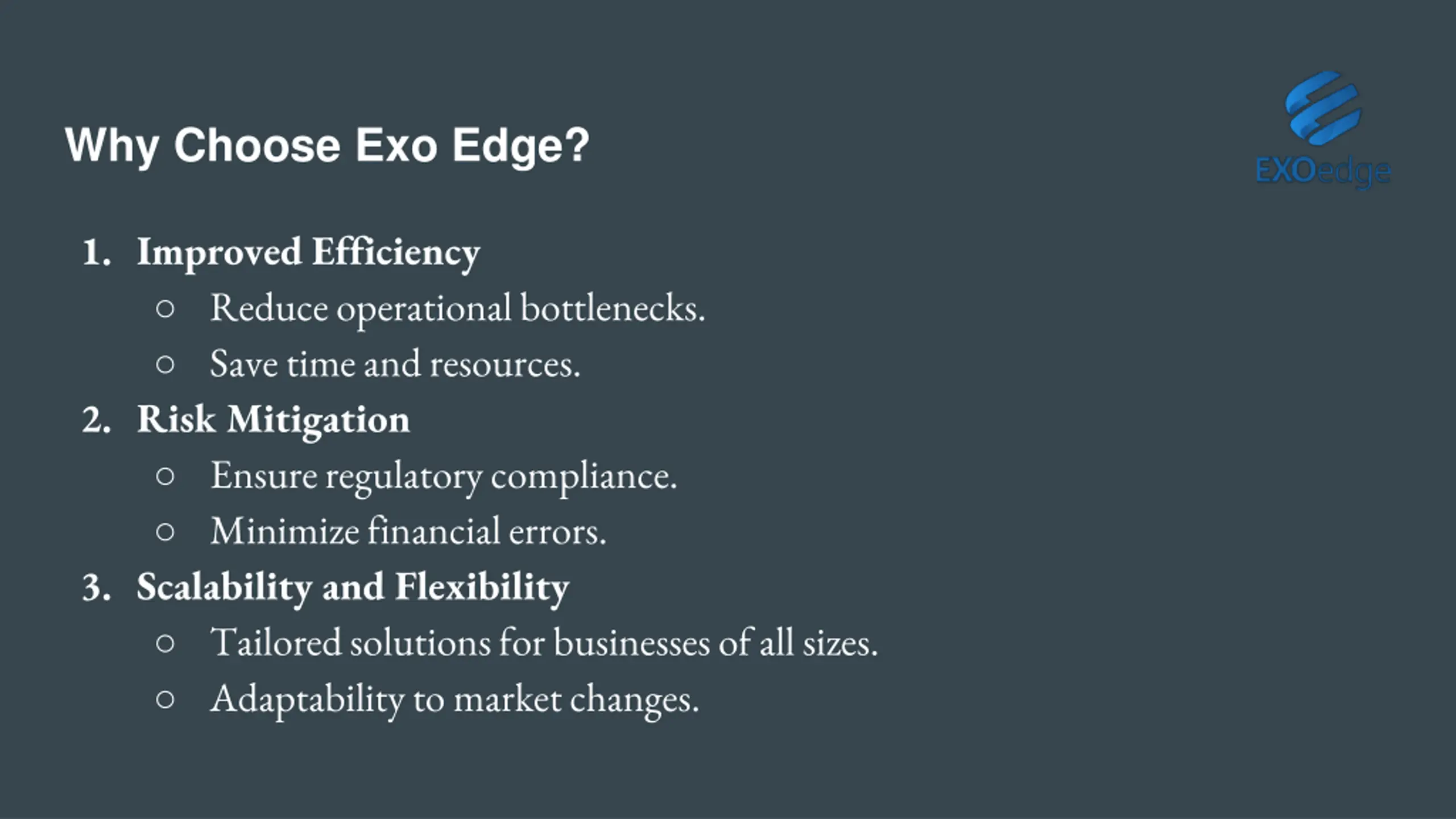 Why Choose Exo Edge? 1. Improved Efficiency Reduce operational bottlenecks. Save time and resources. 2. Risk Mitigation Ensure regulatory compliance. Minimize financial errors. 3. Scalability and Flexibility Tailored solutions for businesses of all sizes. Adaptability to market changes.