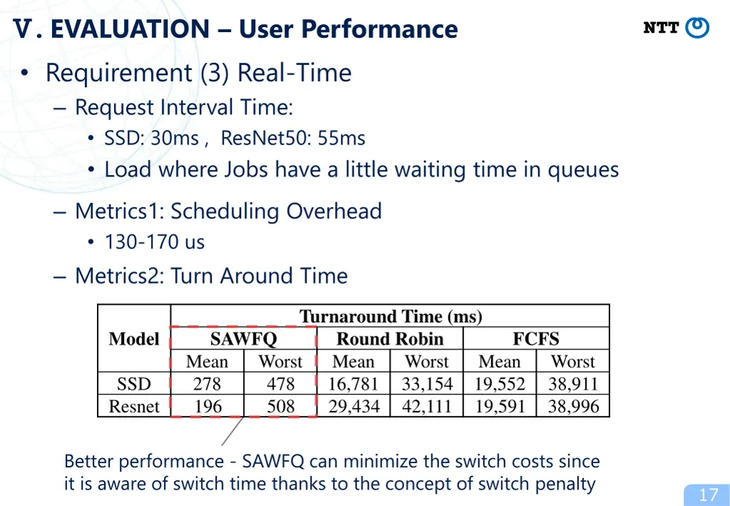 . PEFORMANCE EVALUATION Implemented the System of SAWFQ on FPGA The System Evaluated with Traditional Algorithms FCFS (First Come First Served), RR (Round Robin) Three Evaluation Points: 1. User Performance 2. Fairness Among Users 3. Resource Efficiency Table I. Evaluation Environment Server CPU Host Memory FPGA OS Driver Dell R740 PowerEdge Intel Xeon Gold 5118 96 GB Xilinx Alveo U50LV Ubuntu 18.04.4 XRT 2019.2 Hardware Software Two CNN Models on Programmable-Model Accelerator: SSD, ResNet50 Each CNN user issues inference requests periodically 16