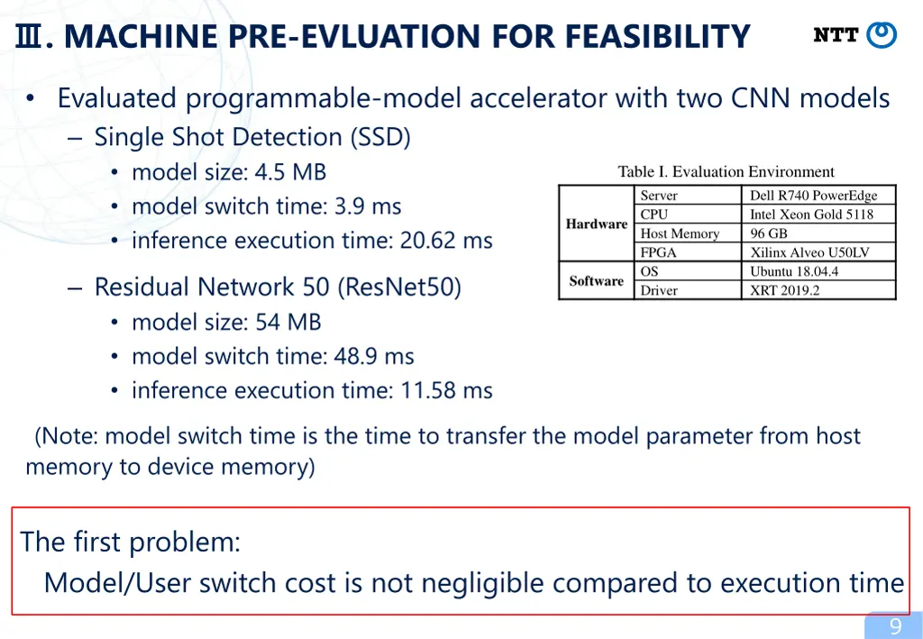 . MACHINE PRE-EVLUATION FOR FEASIBILITY Evaluated programmable-model accelerator with two CNN models Single Shot Detection (SSD) model size: 4.5 MB model switch time: 3.9 ms inference execution time: 20.62 ms Table I. Evaluation Environment Server CPU Host Memory FPGA OS Driver Dell R740 PowerEdge Intel Xeon Gold 5118 96 GB Xilinx Alveo U50LV Ubuntu 18.04.4 XRT 2019.2 Hardware Residual Network 50 (ResNet50) model size: 54 MB model switch time: 48.9 ms inference execution time: 11.58 ms Software (Note: model switch time is the time to transfer the model parameter from host memory to device memory) The first problem: Model/User switch cost is not negligible compared to execution time 9
