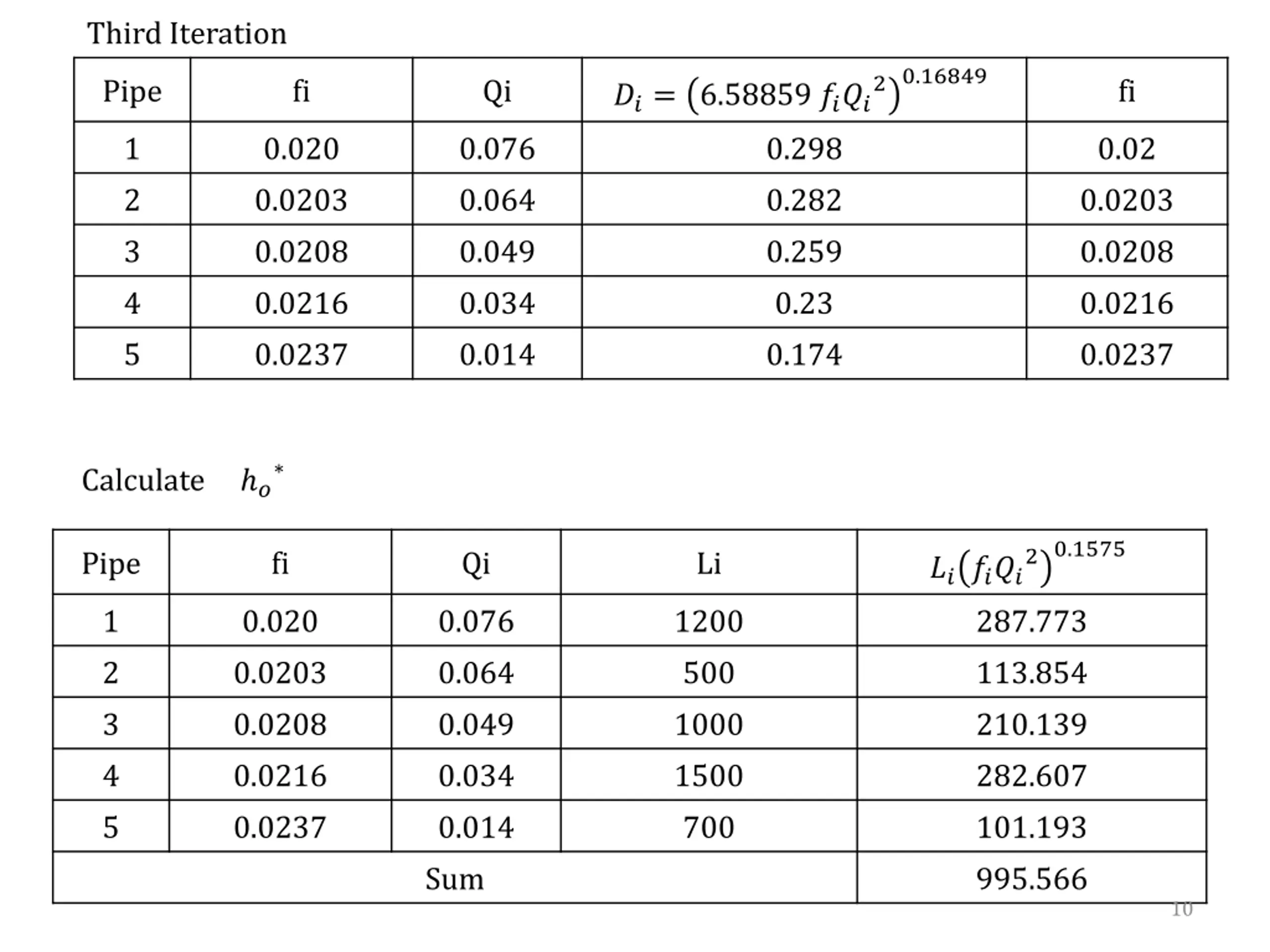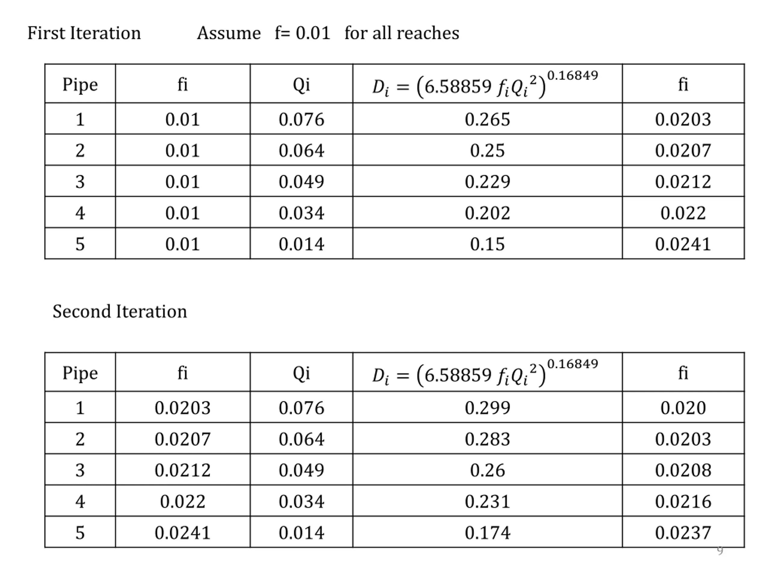 First Iteration Assume f= 0.01 for all reaches ??= 6.58859 ????20.16849 0.265 0.25 0.229 0.202 0.15 Pipe fi Qi fi 1 2 3 4 5 0.01 0.01 0.01 0.01 0.01 0.076 0.064 0.049 0.034 0.014 0.0203 0.0207 0.0212 0.022 0.0241 Second Iteration ??= 6.58859 ????20.16849 0.299 0.283 0.26 0.231 0.174 Pipe fi Qi fi 1 2 3 4 5 0.0203 0.0207 0.0212 0.022 0.0241 0.076 0.064 0.049 0.034 0.014 0.020 0.0203 0.0208 0.0216 0.0237 9
