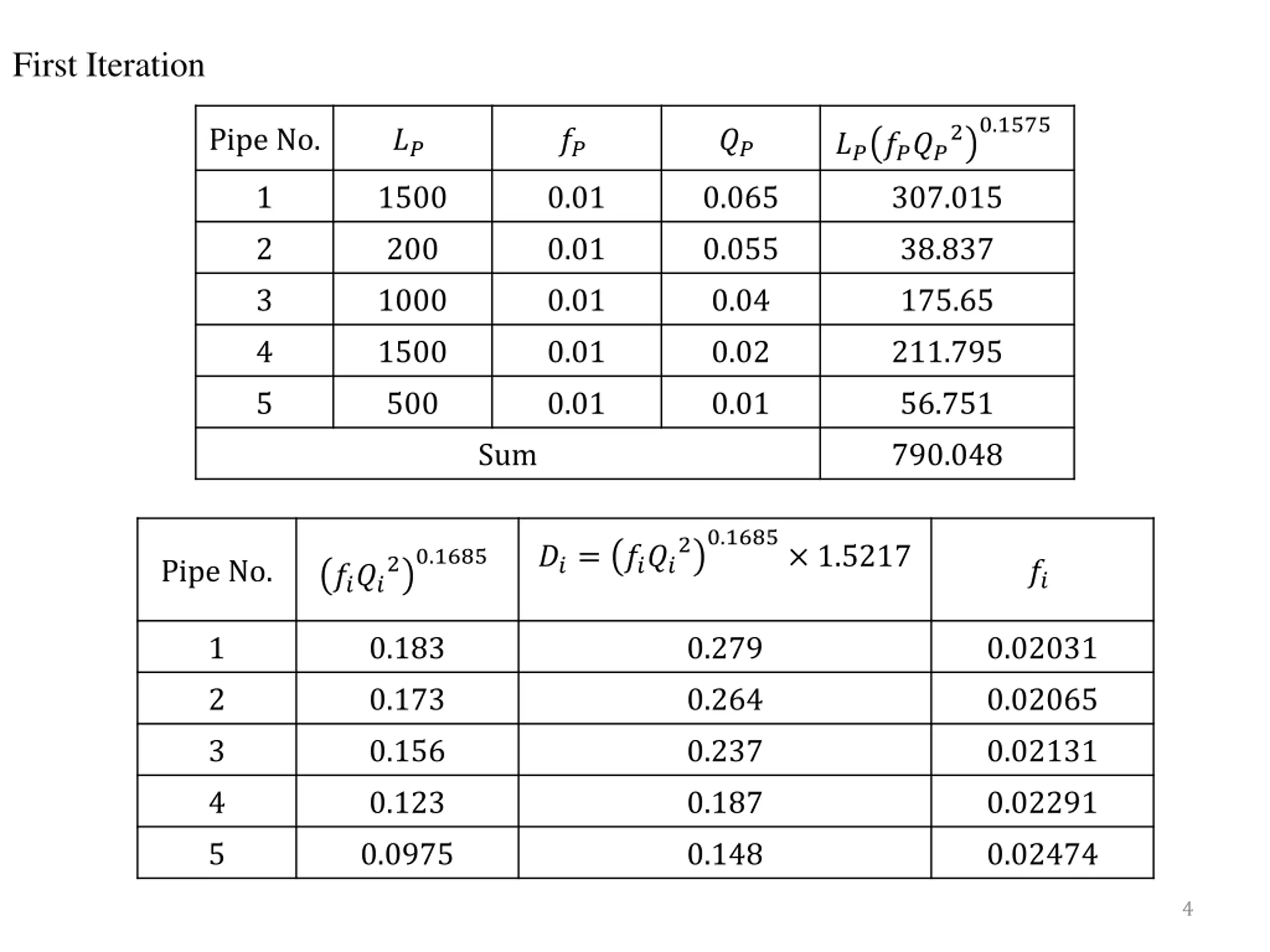 First Iteration ??????20.1575 307.015 38.837 175.65 211.795 56.751 790.048 Pipe No. ?? ?? ?? 1 2 3 4 5 1500 200 1000 1500 500 0.01 0.01 0.01 0.01 0.01 0.065 0.055 0.04 0.02 0.01 Sum ??= ????20.1685 1.5217 ????20.1685 Pipe No. ?? 1 2 3 4 5 0.183 0.173 0.156 0.123 0.0975 0.279 0.264 0.237 0.187 0.148 0.02031 0.02065 0.02131 0.02291 0.02474 4