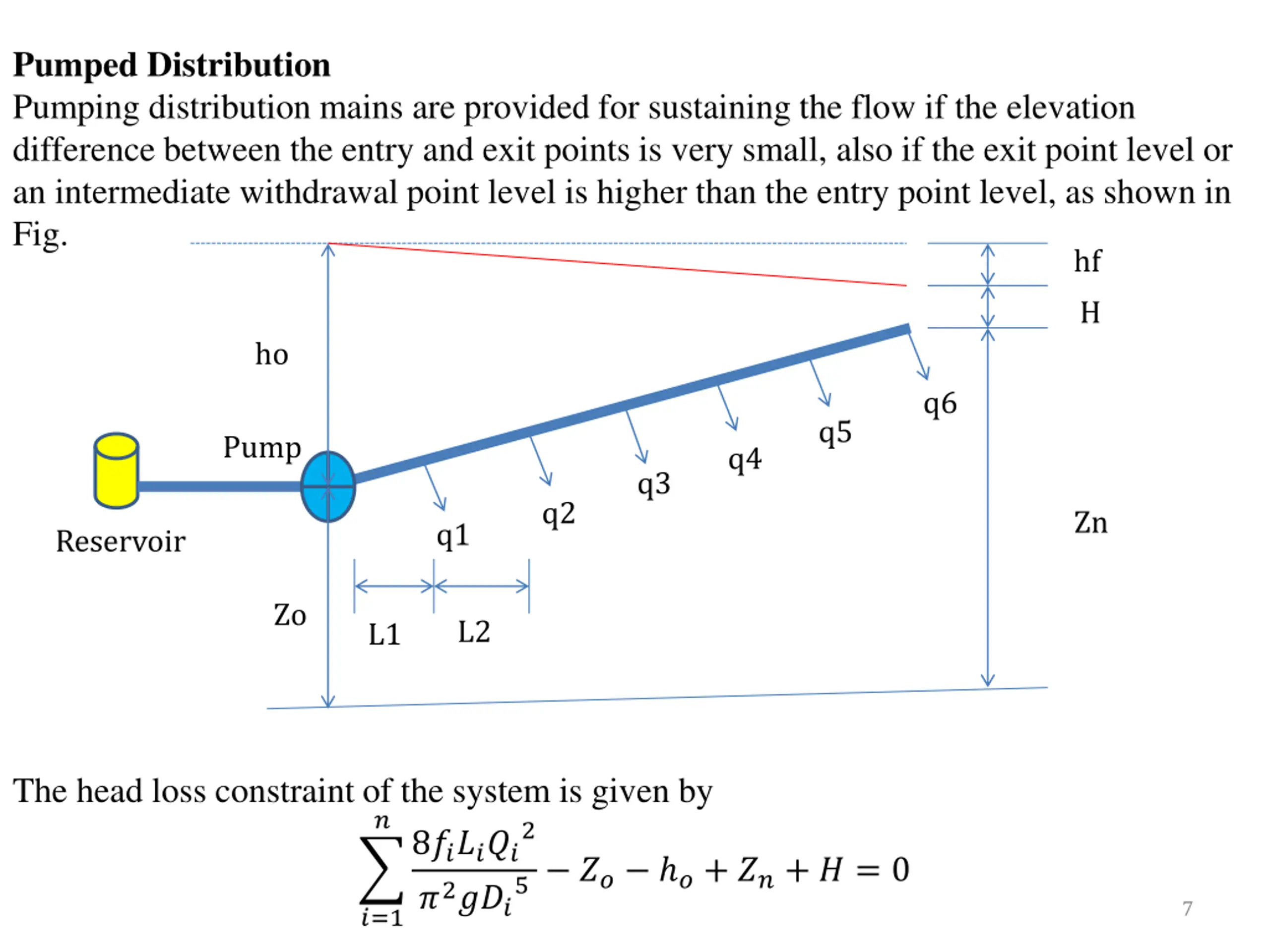Pumped Distribution Pumping distribution mains are provided for sustaining the flow if the elevation difference between the entry and exit points is very small, also if the exit point level or an intermediate withdrawal point level is higher than the entry point level, as shown in Fig. hf H ho q6 q5 Pump q4 q3 q2 Zn q1 Reservoir Zo L2 L1 The head loss constraint of the system is given by ? 8??????2 ?2???5 ?? ?+ ??+ ? = 0 7 ?=1