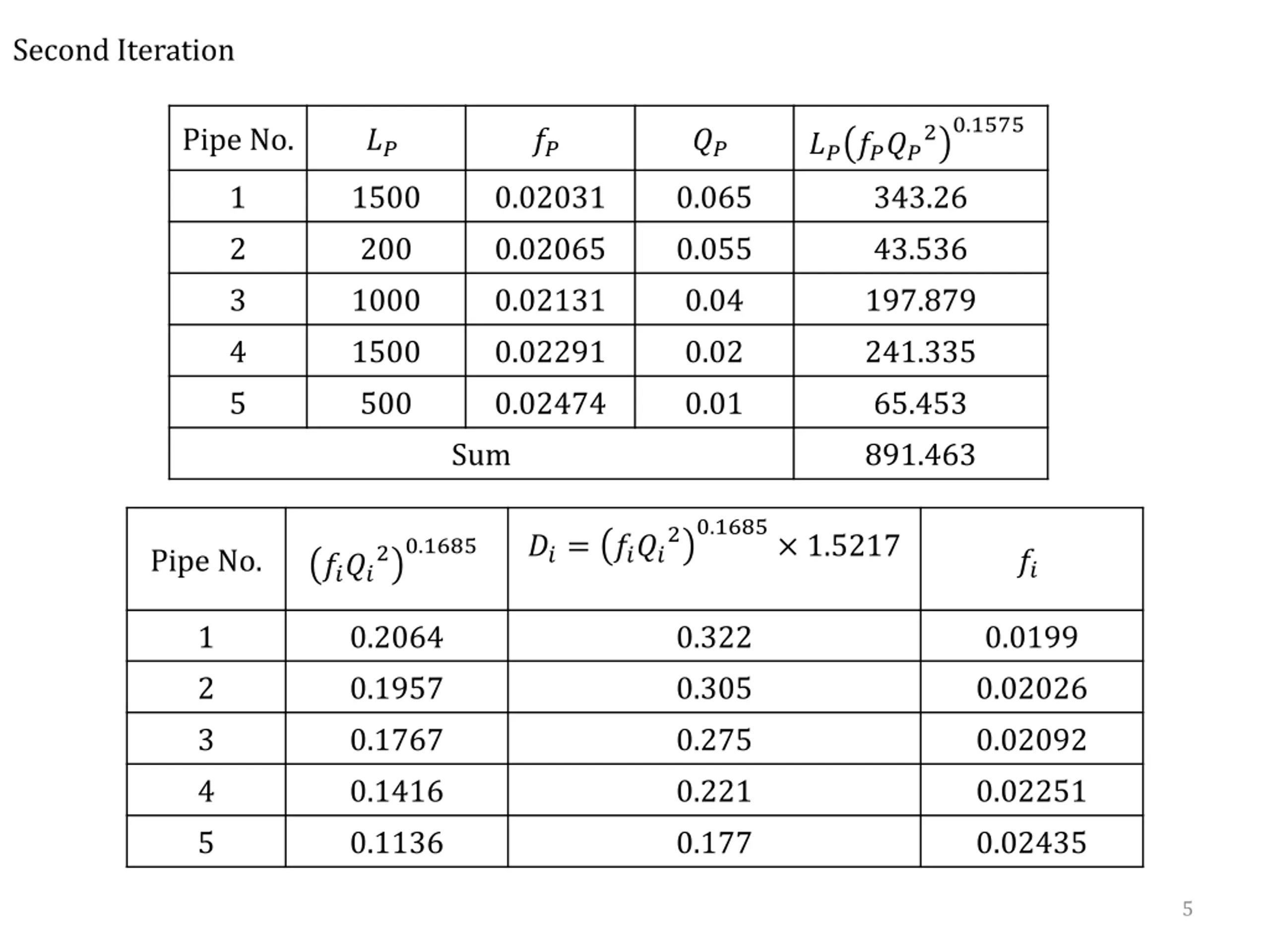 Second Iteration ??????20.1575 343.26 43.536 197.879 241.335 65.453 891.463 Pipe No. ?? ?? ?? 1 2 3 4 5 1500 200 1000 1500 500 0.02031 0.02065 0.02131 0.02291 0.02474 Sum 0.065 0.055 0.04 0.02 0.01 ??= ????20.1685 1.5217 ????20.1685 Pipe No. ?? 1 2 3 4 5 0.2064 0.1957 0.1767 0.1416 0.1136 0.322 0.305 0.275 0.221 0.177 0.0199 0.02026 0.02092 0.02251 0.02435 5