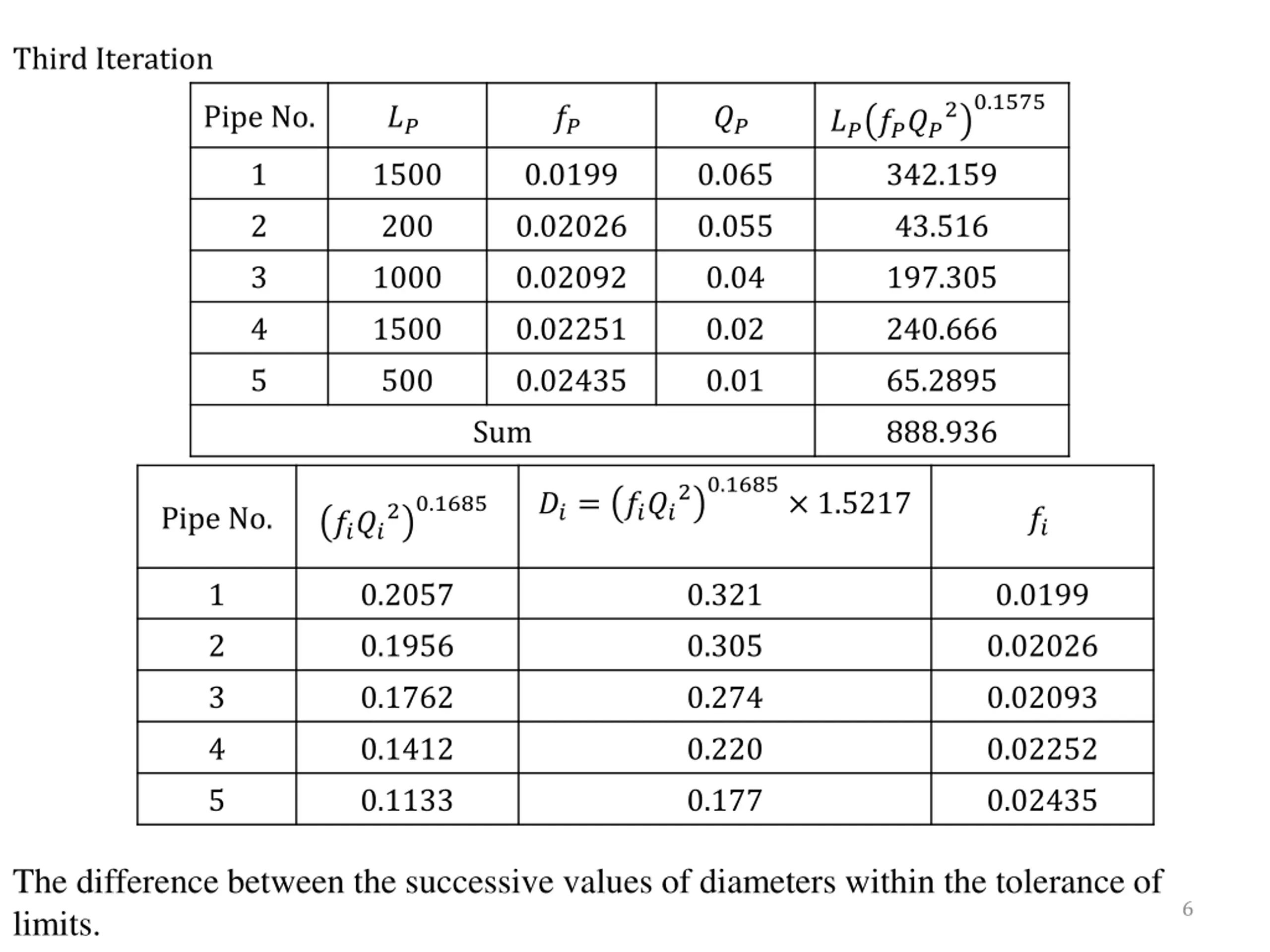 Third Iteration ??????20.1575 342.159 43.516 197.305 240.666 65.2895 888.936 Pipe No. ?? ?? ?? 1 2 3 4 5 1500 200 1000 1500 500 0.0199 0.02026 0.02092 0.02251 0.02435 Sum 0.065 0.055 0.04 0.02 0.01 ??= ????20.1685 1.5217 ????20.1685 Pipe No. ?? 1 2 3 4 5 0.2057 0.1956 0.1762 0.1412 0.1133 0.321 0.305 0.274 0.220 0.177 0.0199 0.02026 0.02093 0.02252 0.02435 The difference between the successive values of diameters within the tolerance of limits. 6