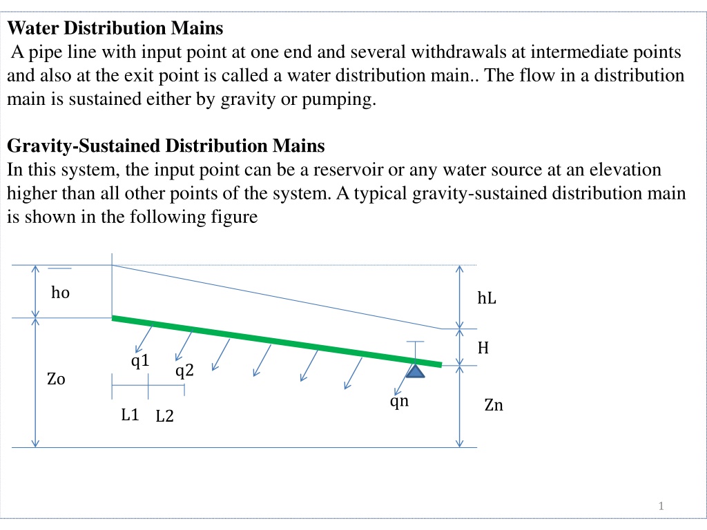 Water Distribution Mains A pipe line with input point at one end and several withdrawals at intermediate points and also at the exit point is called a water distribution main.. The flow in a distribution main is sustained either by gravity or pumping. Gravity-Sustained Distribution Mains In this system, the input point can be a reservoir or any water source at an elevation higher than all other points of the system. A typical gravity-sustained distribution main is shown in the following figure ho hL H q1 q2 Zo qn Zn L1 L2 1