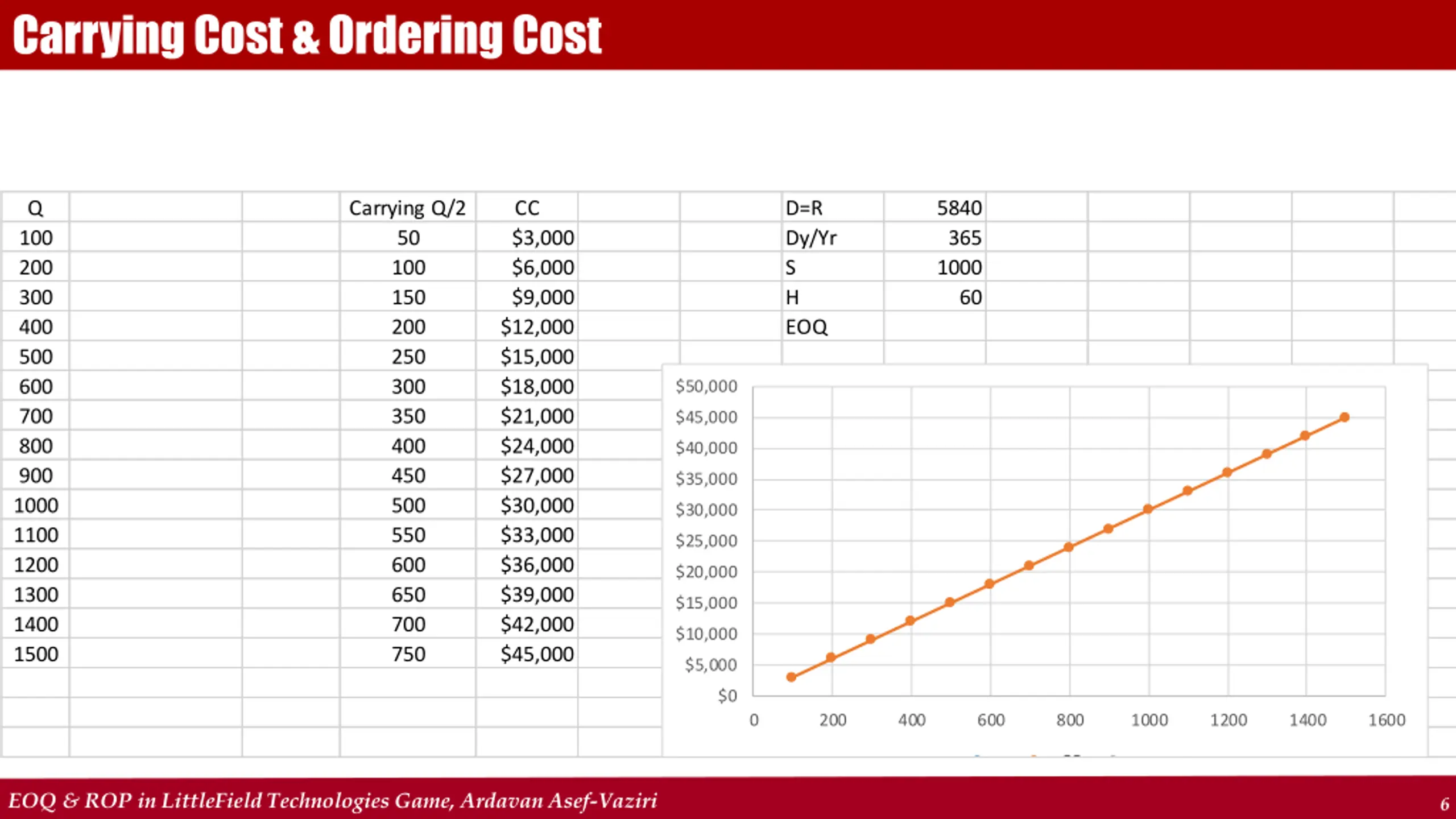 Average Inventory & Carrying Cost At the start of cycle, we have the order size Q units, at the end of the cycle we have 0. Average inventory = (Q+0)/2 = Q/2 units Q/2 is also called cycle inventory. Quantity Time In each cycle we have Q/2 inventory In all cycles we have Q/2 inventory. Throughout the year we have Q/2 inventory. Cost of carrying (holding) one unit of inventory for one year = H $ per unit per year. Total Holding Costs (Total Carrying Costs) = CC = HQ/2 $ per year EOQ & ROP in LittleField Technologies Game, Ardavan Asef-Vaziri 5