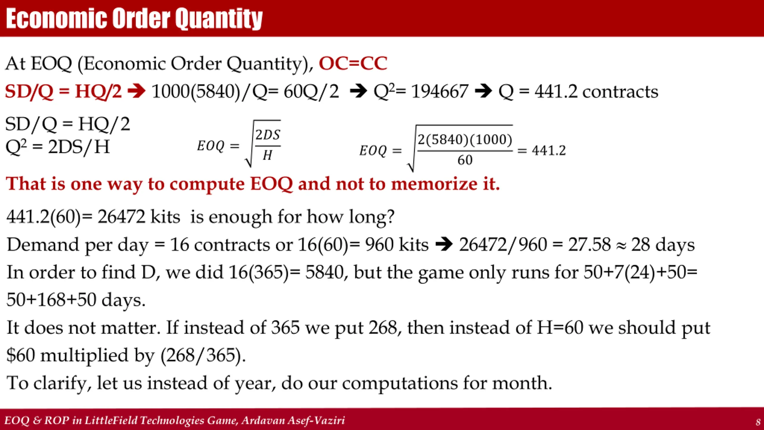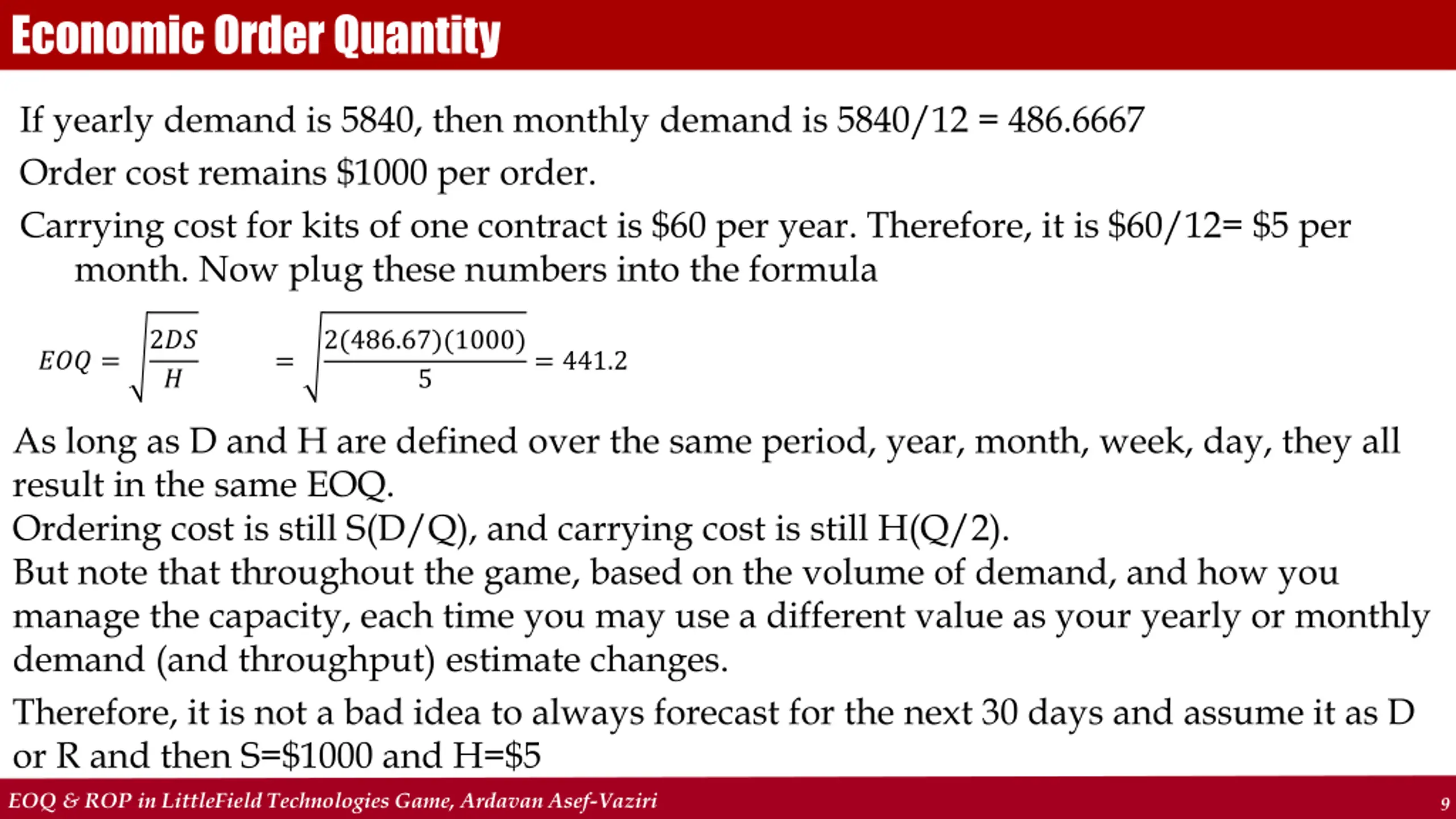 Economic Order Quantity At EOQ (Economic Order Quantity), OC=CC SD/Q = HQ/2 1000(5840)/Q= 60Q/2 Q2= 194667 Q = 441.2 contracts SD/Q = HQ/2 Q2 = 2DS/H 2?? ? 2(5840)(1000) 60 ??? = ??? = = 441.2 That is one way to compute EOQ and not to memorize it. 441.2(60)= 26472 kits is enough for how long? Demand per day = 16 contracts or 16(60)= 960 kits 26472/960 = 27.58 28 days In order to find D, we did 16(365)= 5840, but the game only runs for 50+7(24)+50= 50+168+50 days. It does not matter. If instead of 365 we put 268, then instead of H=60 we should put $60 multiplied by (268/365). To clarify, let us instead of year, do our computations for month. EOQ & ROP in LittleField Technologies Game, Ardavan Asef-Vaziri 8