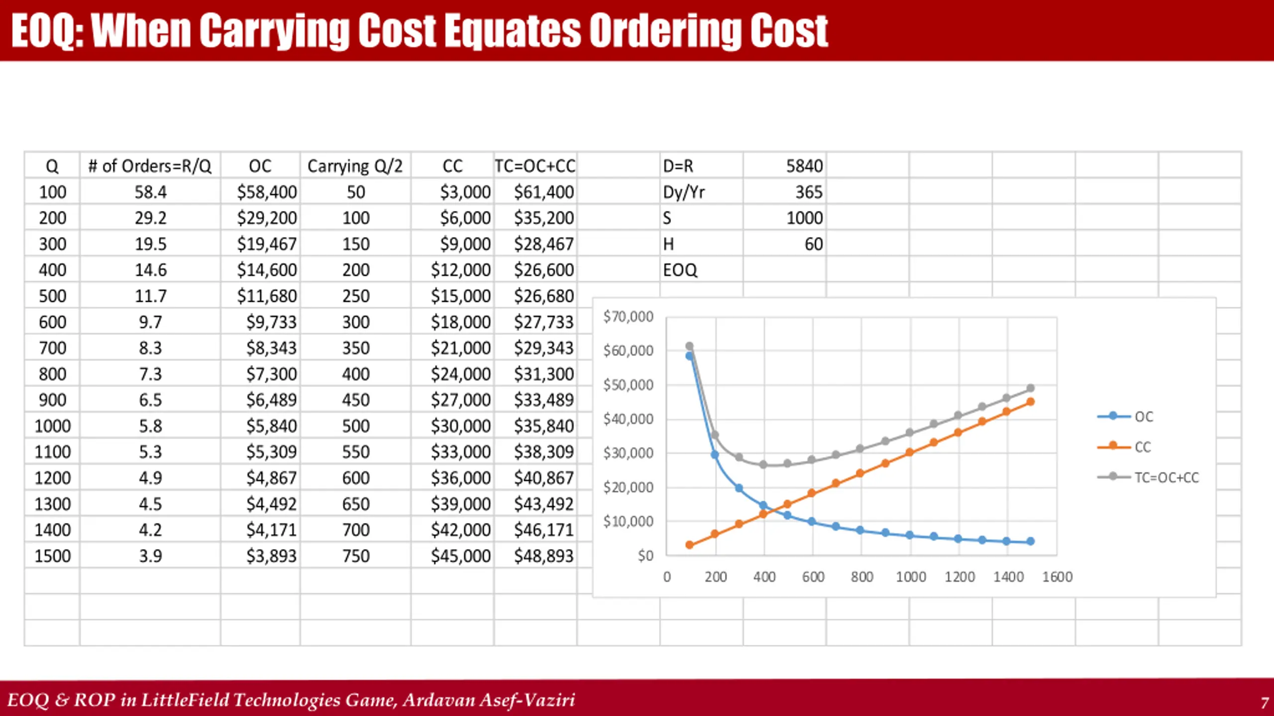 "Learn how to determine optimal order quantities to minimize total costs in LittleField Technologies game by considering economic order quantity (EOQ) models and reorder point (ROP) strategies. Understand the calculations for ordering quantities, carrying costs, and average inventory levels to enhance inventory management efficiency and profitability."