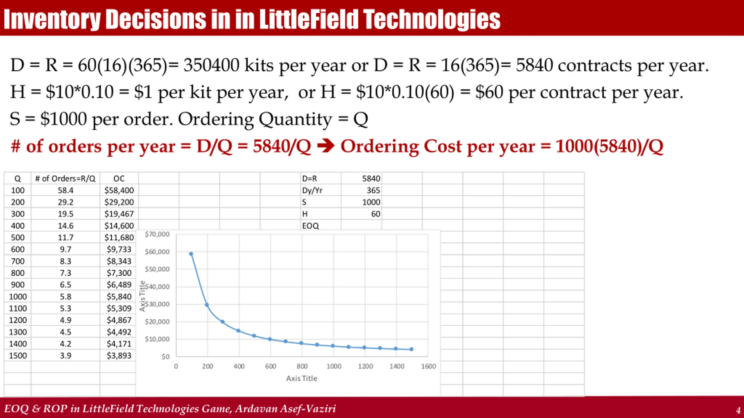 Inventory Decisions in LittleField Technologies In our EOQ (Economic Order Quantity) models, R and D are used interchangeably. D is demand, R is throughput. We assume R=D Everything produced is sold. Assume that the average demand in a LittleField Technology game is 16 contracts per day, and assume it is relatively stable; it is stationary. Assume that you have enough capacity to fulfill the demand. We need 60 kits for each contract at the rate of $10 per kit. While the demand is probabilistic, and moves up and down around the average, in order to be able to use the EOQ model, we need to assume that the demand is deterministic. Therebefore, the kits are used at a steady rate per day and a year is 365 days. The game assumes no storage and no obsolescence cost during the period that we have access to the game. Holding cost is 10% of the purchase price. Ordering cost is $1000 per order. How much should we order each time to minimize our total costs (total ordering and carrying costs)? EOQ & ROP in LittleField Technologies Game, Ardavan Asef-Vaziri 3