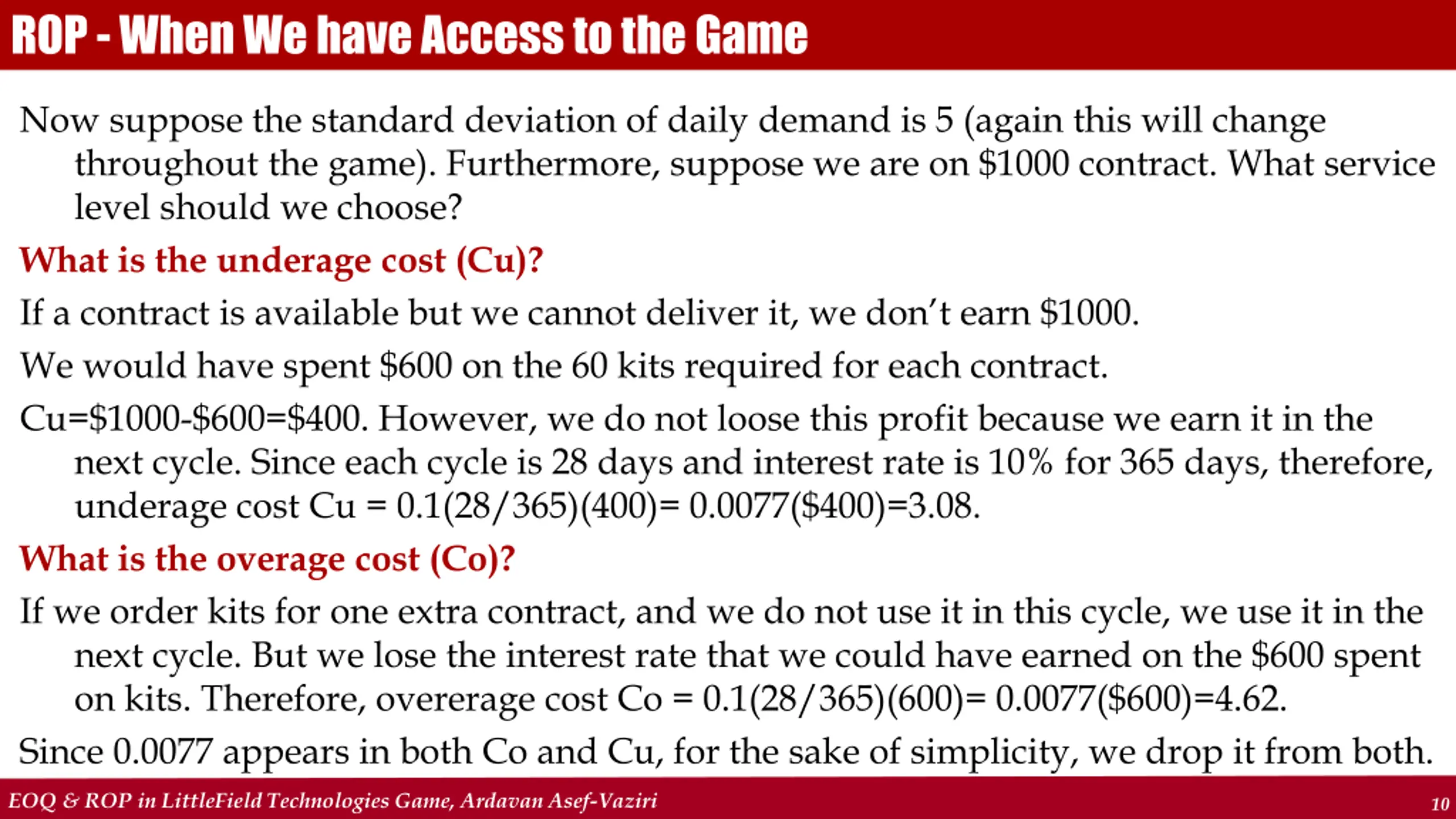 ROP - When We have Access to the Game Now suppose the standard deviation of daily demand is 5 (again this will change throughout the game). Furthermore, suppose we are on $1000 contract. What service level should we choose? What is the underage cost (Cu)? If a contract is available but we cannot deliver it, we don t earn $1000. We would have spent $600 on the 60 kits required for each contract. Cu=$1000-$600=$400. However, we do not loose this profit because we earn it in the next cycle. Since each cycle is 28 days and interest rate is 10% for 365 days, therefore, underage cost Cu = 0.1(28/365)(400)= 0.0077($400)=3.08. What is the overage cost (Co)? If we order kits for one extra contract, and we do not use it in this cycle, we use it in the next cycle. But we lose the interest rate that we could have earned on the $600 spent on kits. Therefore, overerage cost Co = 0.1(28/365)(600)= 0.0077($600)=4.62. Since 0.0077 appears in both Co and Cu, for the sake of simplicity, we drop it from both. EOQ & ROP in LittleField Technologies Game, Ardavan Asef-Vaziri 10