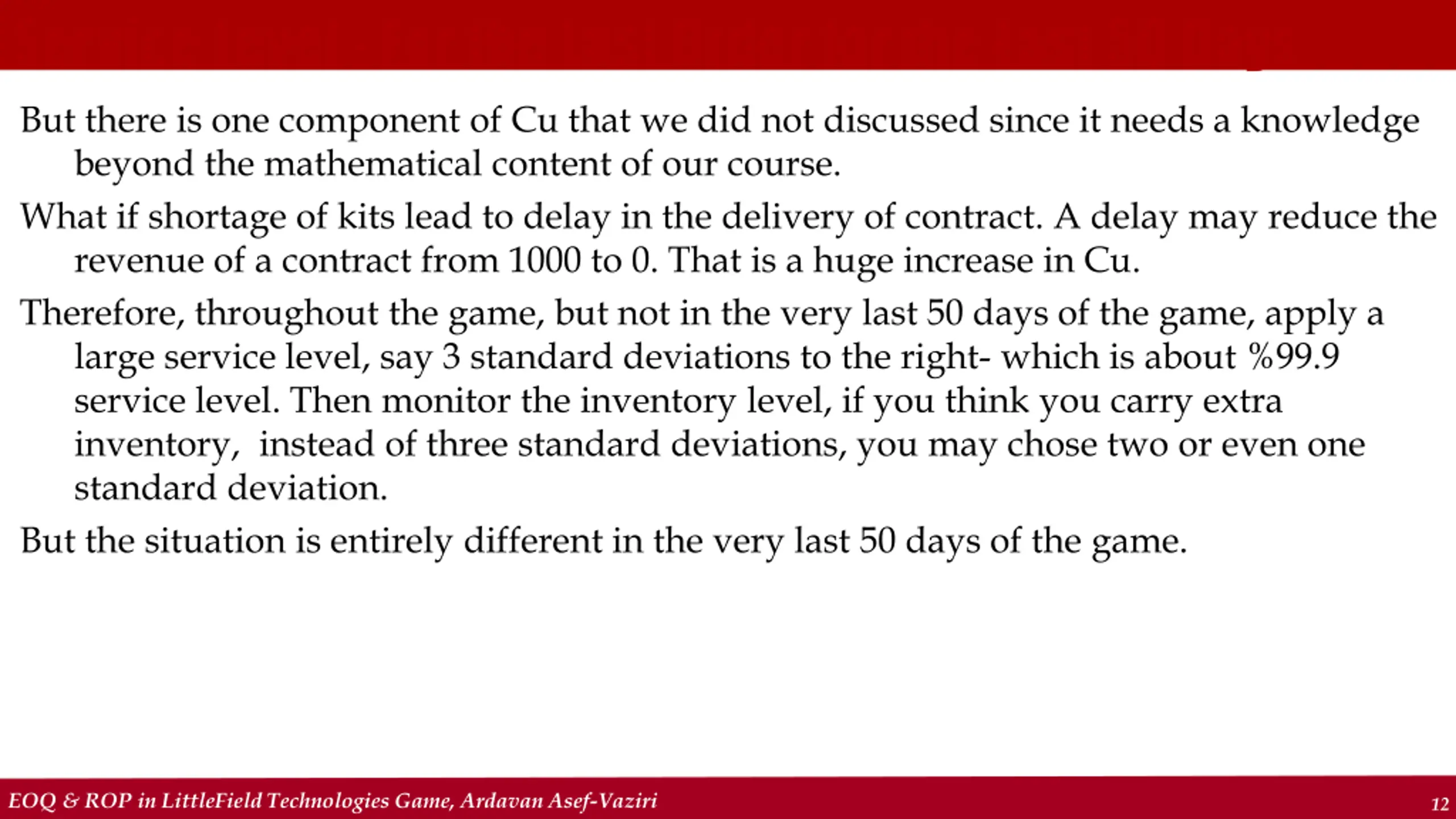 Service Level - For the Last Order for the Last 50 Days But there is one component of Cu that we did not discussed since it needs a knowledge beyond the mathematical content of our course. What if shortage of kits lead to delay in the delivery of contract. A delay may reduce the revenue of a contract from 1000 to 0. That is a huge increase in Cu. Therefore, throughout the game, but not in the very last 50 days of the game, apply a large service level, say 3 standard deviations to the right- which is about %99.9 service level. Then monitor the inventory level, if you think you carry extra inventory, instead of three standard deviations, you may chose two or even one standard deviation. But the situation is entirely different in the very last 50 days of the game. EOQ & ROP in LittleField Technologies Game, Ardavan Asef-Vaziri 12