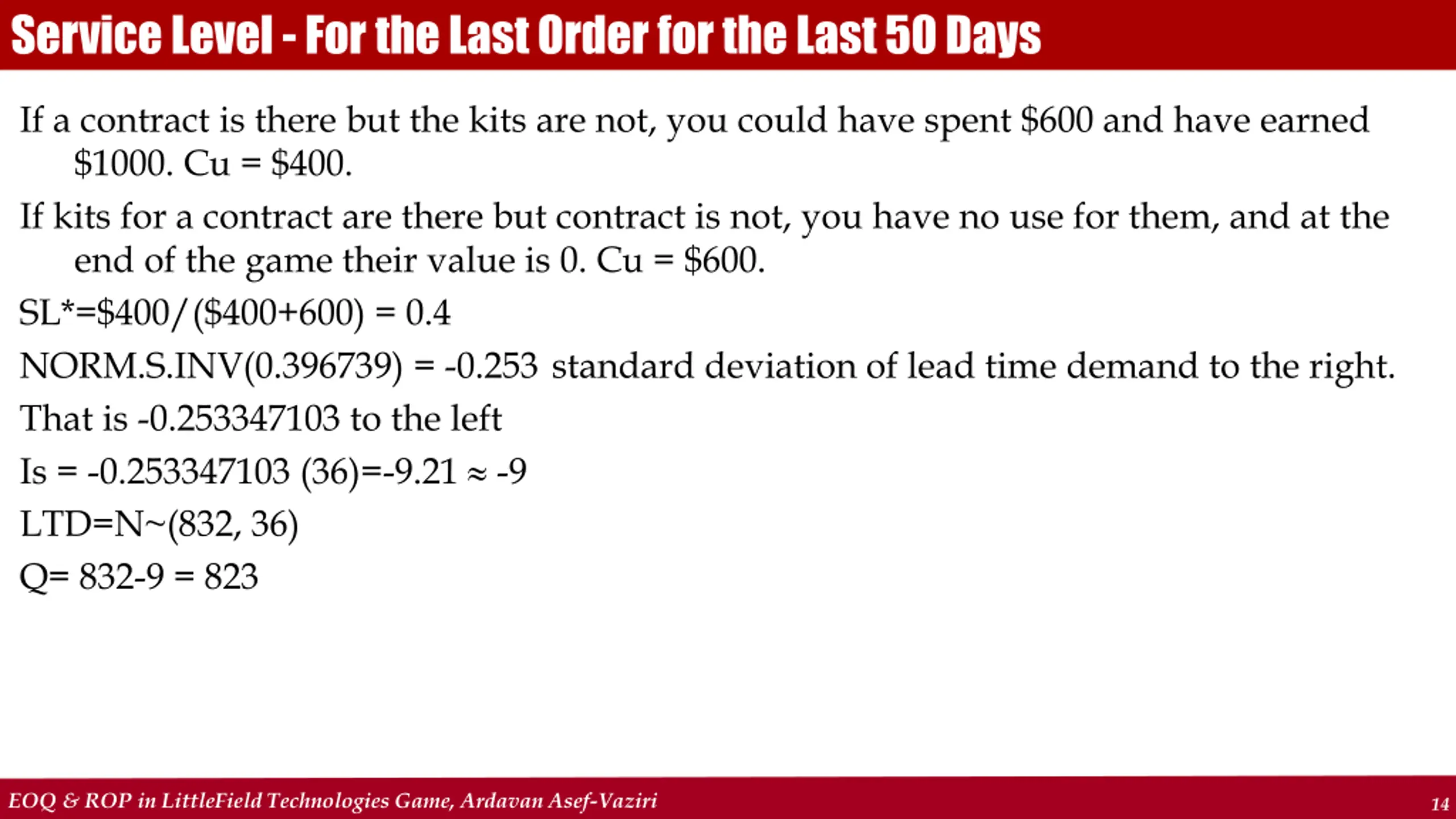 Service Level - For the Last Order for the Last 50 Days If a contract is there but the kits are not, you could have spent $600 and have earned $1000. Cu = $400. If kits for a contract are there but contract is not, you have no use for them, and at the end of the game their value is 0. Cu = $600. SL*=$400/($400+600) = 0.4 NORM.S.INV(0.396739) = -0.253standard deviation of lead time demand to the right. That is -0.253347103 to the left Is = -0.253347103 (36)=-9.21 -9 LTD=N~(832, 36) Q= 832-9 = 823 EOQ & ROP in LittleField Technologies Game, Ardavan Asef-Vaziri 14