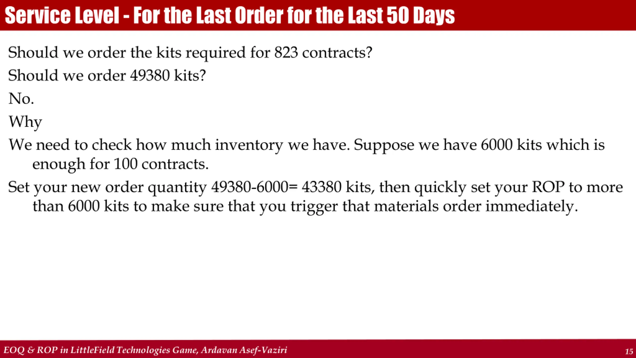 Service Level - For the Last Order for the Last 50 Days Should we order the kits required for 823 contracts? Should we order 49380 kits? No. Why We need to check how much inventory we have. Suppose we have 6000 kits which is enough for 100 contracts. Set your new order quantity 49380-6000= 43380 kits, then quickly set your ROP to more than 6000 kits to make sure that you trigger that materials order immediately. EOQ & ROP in LittleField Technologies Game, Ardavan Asef-Vaziri 15