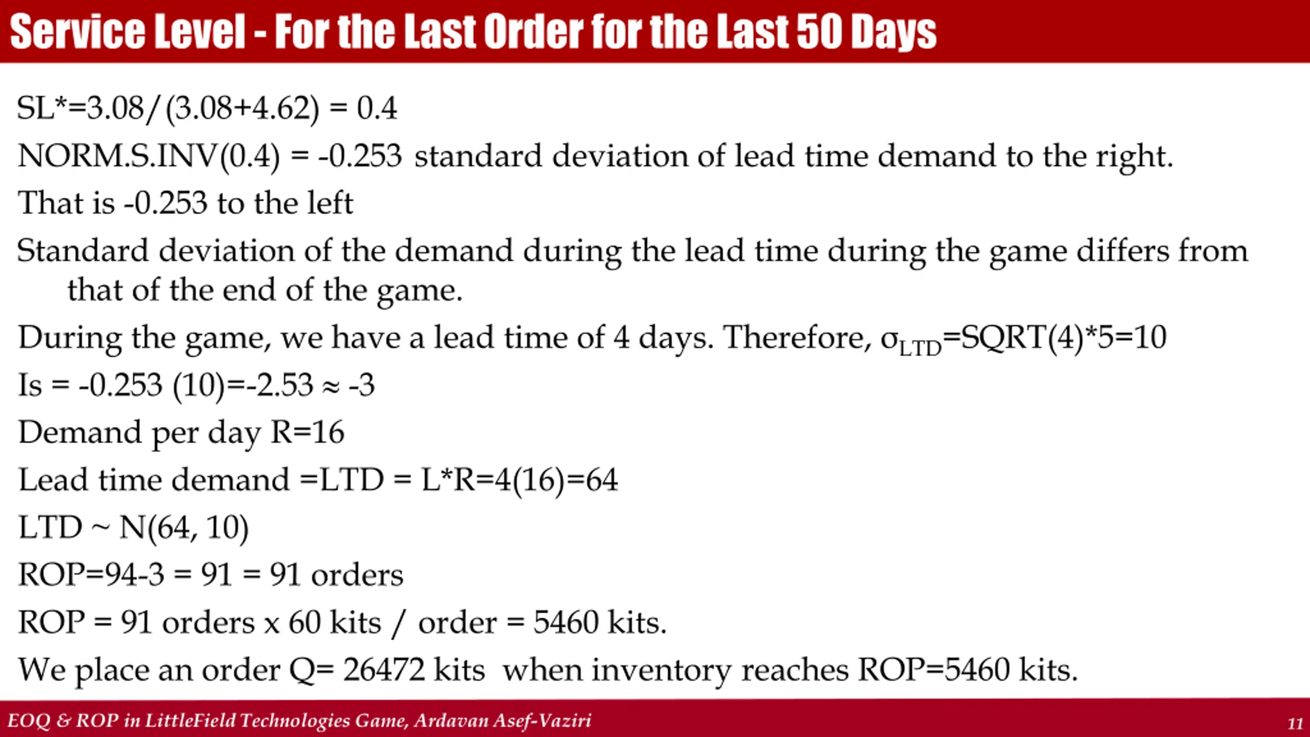 Service Level - For the Last Order for the Last 50 Days SL*=3.08/(3.08+4.62) = 0.4 NORM.S.INV(0.4) = -0.253standard deviation of lead time demand to the right. That is -0.253 to the left Standard deviation of the demand during the lead time during the game differs from that of the end of the game. During the game, we have a lead time of 4 days. Therefore, LTD=SQRT(4)*5=10 Is = -0.253 (10)=-2.53 -3 Demand per day R=16 Lead time demand =LTD = L*R=4(16)=64 LTD ~ N(64, 10) ROP=94-3 = 91 = 91 orders ROP = 91 orders x 60 kits / order = 5460 kits. We place an order Q= 26472 kits when inventory reaches ROP=5460 kits. EOQ & ROP in LittleField Technologies Game, Ardavan Asef-Vaziri 11
