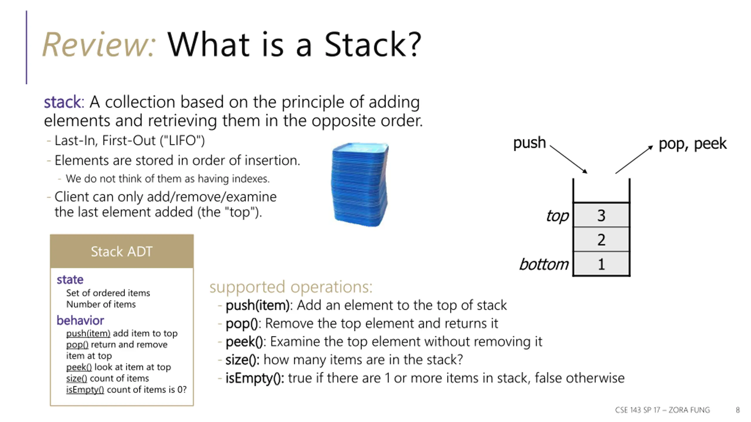 Review: What is a Stack? stack stack: A collection based on the principle of adding elements and retrieving them in the opposite order. - Last-In, First-Out ("LIFO") - Elements are stored in order of insertion. - We do not think of them as having indexes. - Client can only add/remove/examine the last element added (the "top"). push pop, peek top 3 2 1 Stack ADT bottom state state Set of ordered items Number of items supported operations: - push(item) push(item): Add an element to the top of stack - pop() pop(): Remove the top element and returns it - peek() peek(): Examine the top element without removing it - size(): size(): how many items are in the stack? - isEmpty isEmpty(): (): true if there are 1 or more items in stack, false otherwise behavior behavior push(item) add item to top pop() return and remove item at top peek() look at item at top size() count of items isEmpty() count of items is 0? CSE 143 SP 17 ZORA FUNG 8
