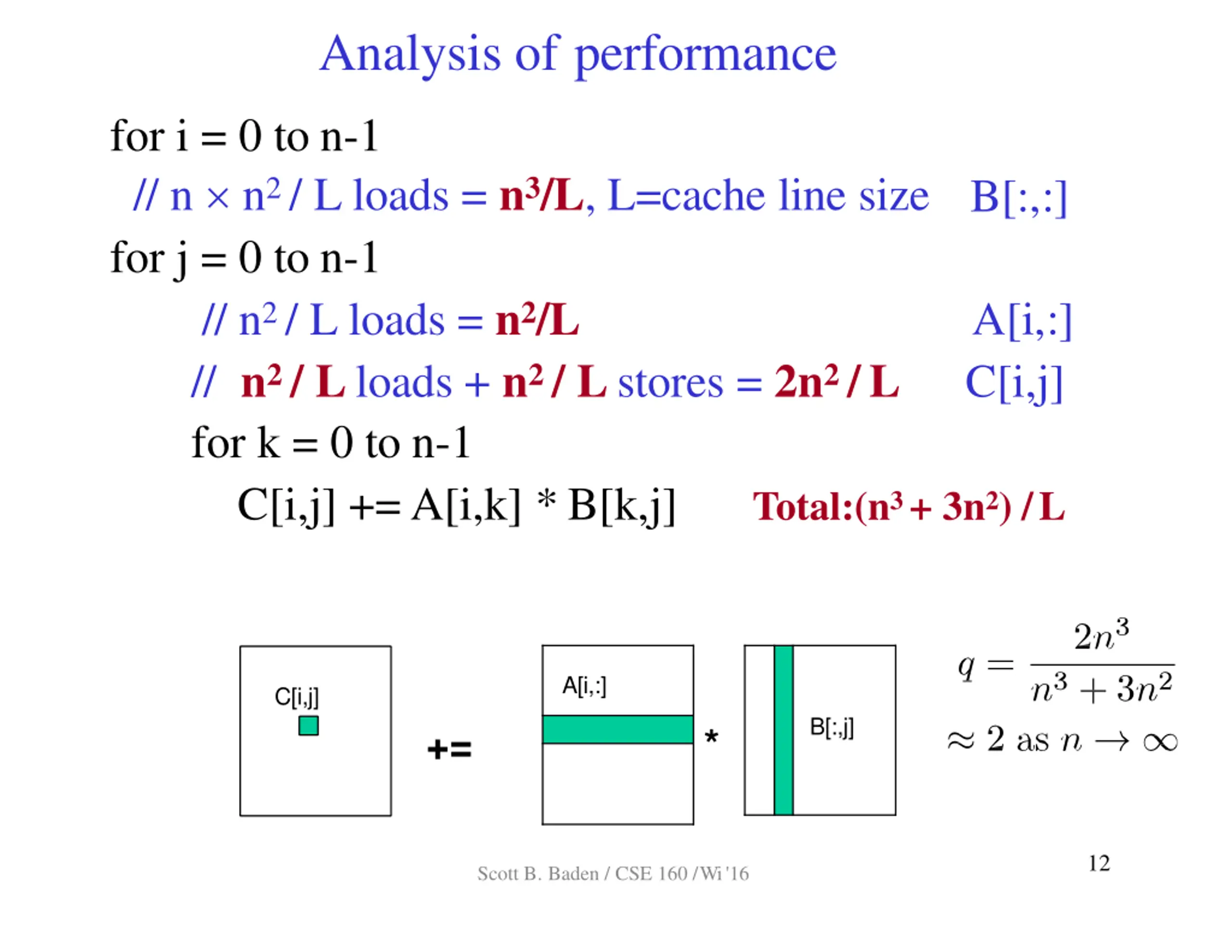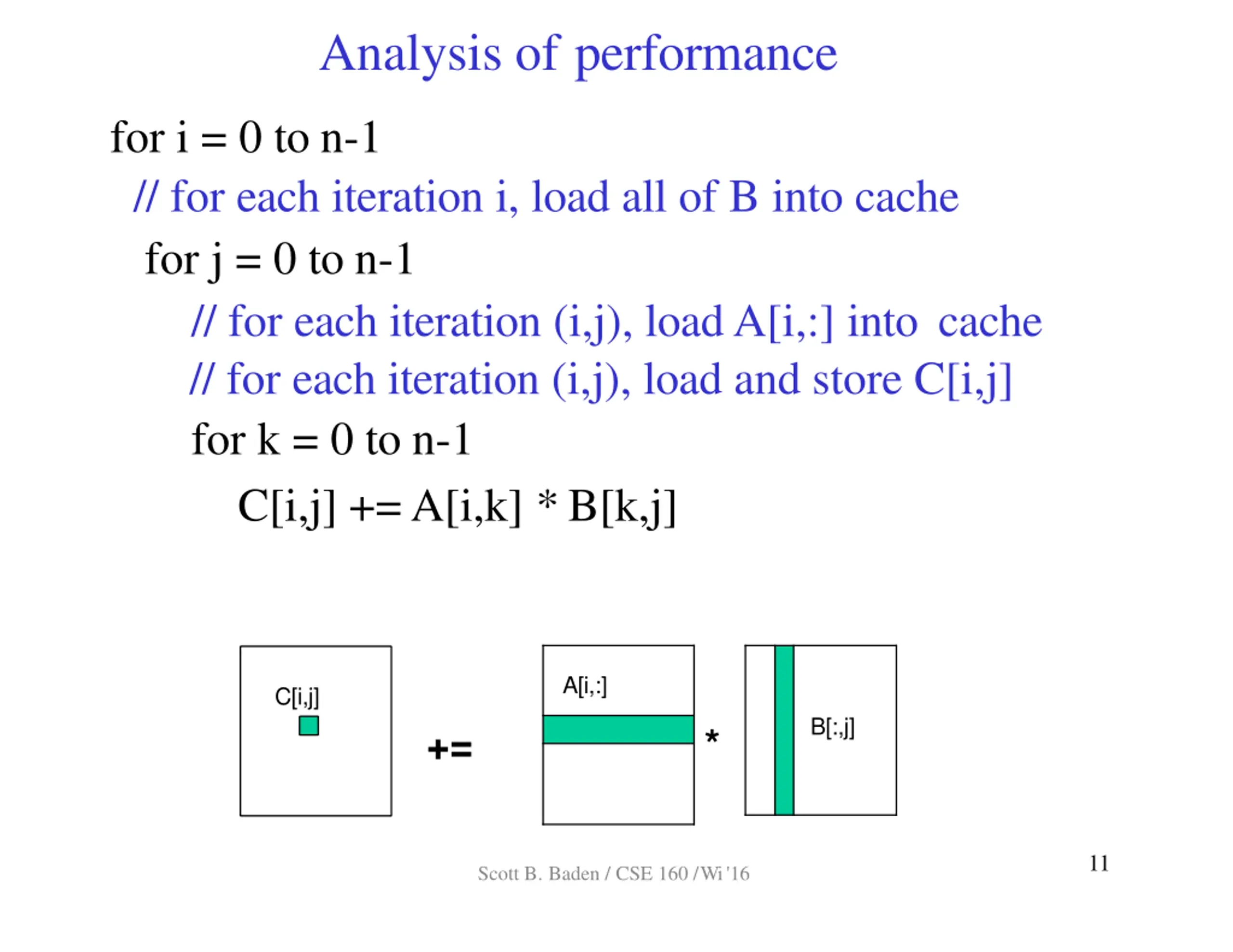 Analysis of performance for i = 0 to n-1 // for each iteration i, load all of B into cache for j = 0 to n-1 // for each iteration (i,j), load A[i,:] into cache // for each iteration (i,j), load and store C[i,j] for k = 0 to n-1 C[i,j] += A[i,k] *B[k,j] A[i,:] C[i,j] B[:,j] += * 11 Scott B. Baden / CSE 160 /Wi '16