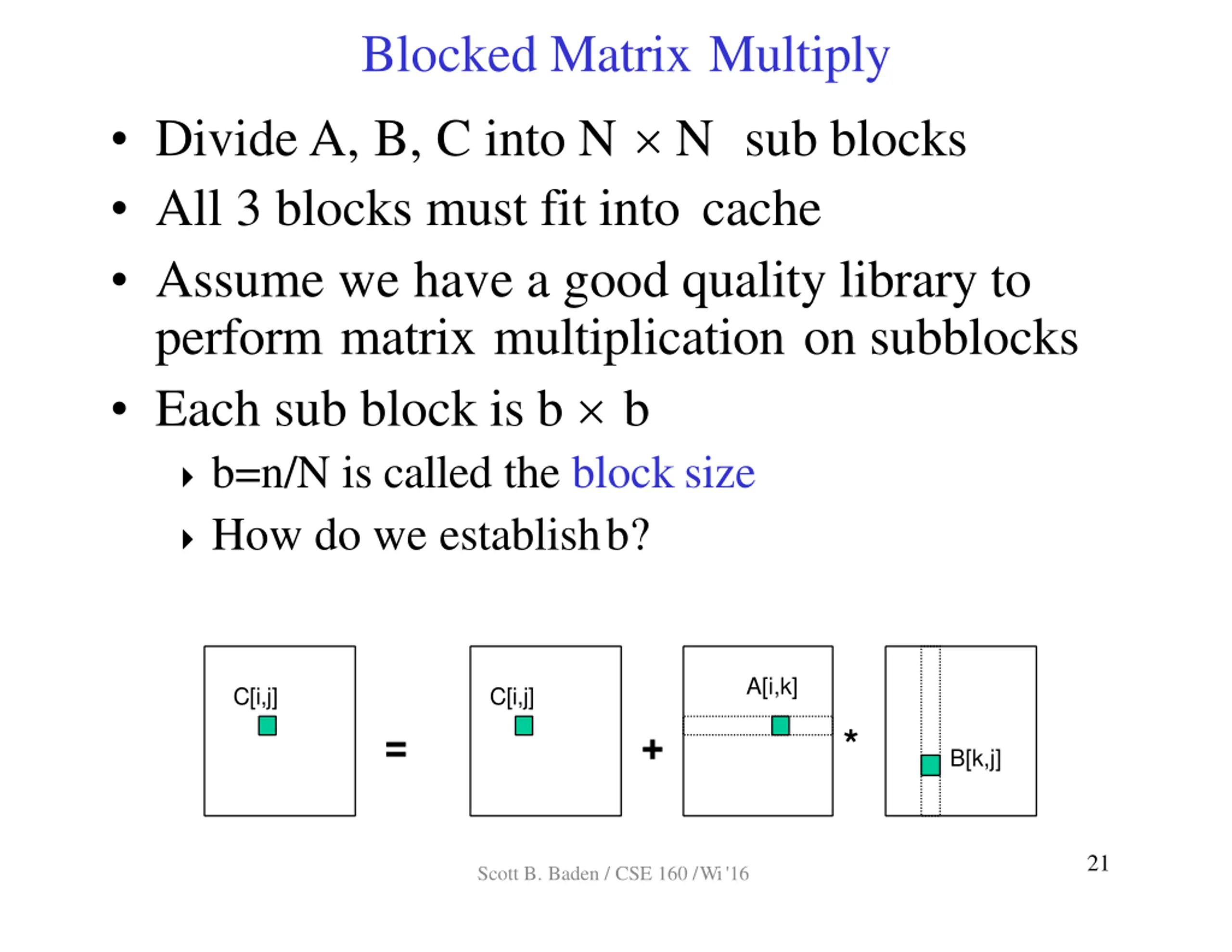 Blocked Matrix Multiply Divide A, B, C into N N sub blocks All 3 blocks must fit into cache Assume we have a good quality library to perform matrix multiplication on subblocks Each sub block is b b b=n/N is called the block size How do we establishb? A[i,k] C[i,j] C[i,j] = + * B[k,j] 21 Scott B. Baden / CSE 160 /Wi '16