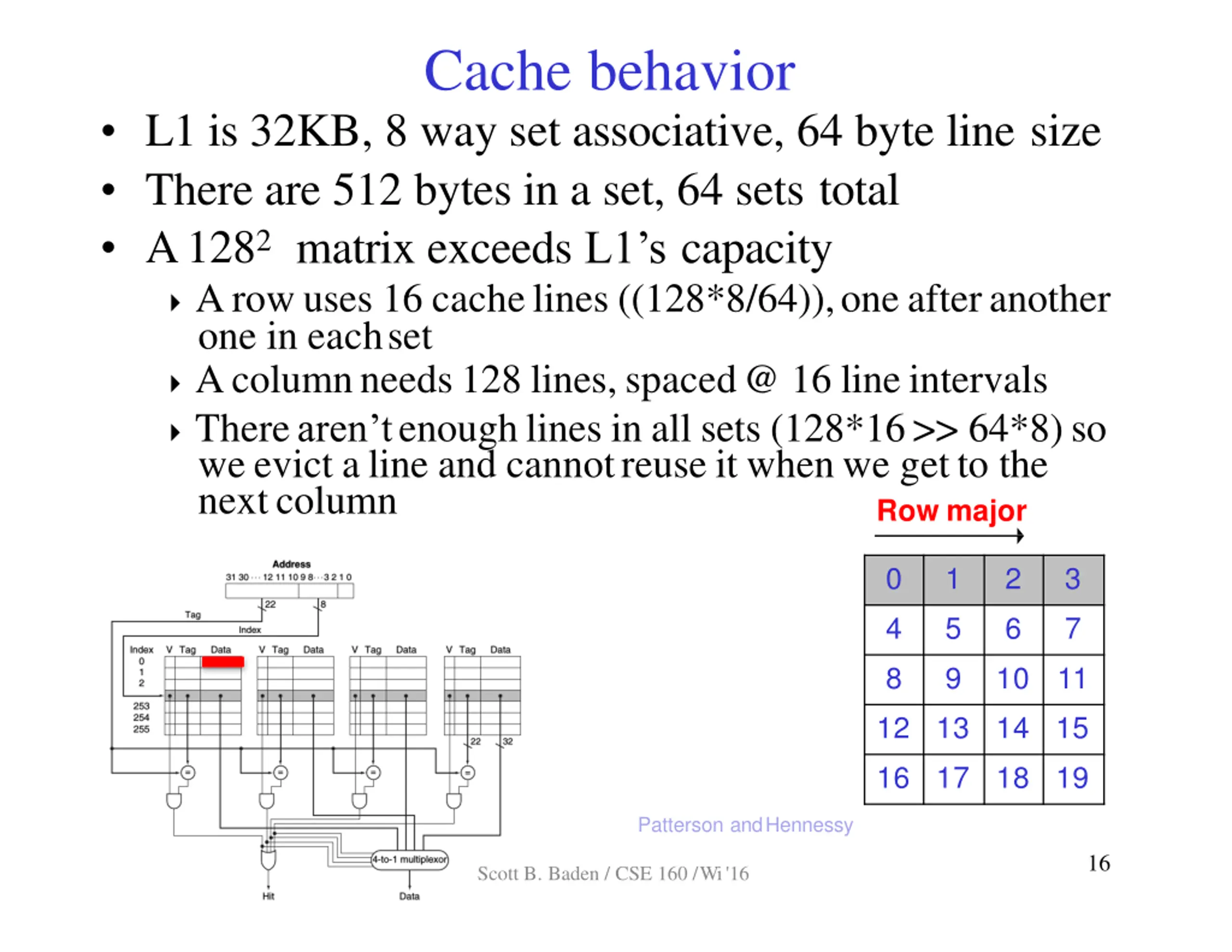 How many cache lines are required to store a column of a 1282matrix? A. 128 B. 128 * 16 C. 128/64 Bang s Clovertown processor L1 is 32KB, 8 way set associative 64 byte linesize 512 bytes in a set, 64 sets total Row major 0 1 2 3 4 5 6 7 8 9 10 11 12 13 14 15 16 17 18 19 Patterson andHennessy 15 Scott B. Baden / CSE 160 /Wi '16