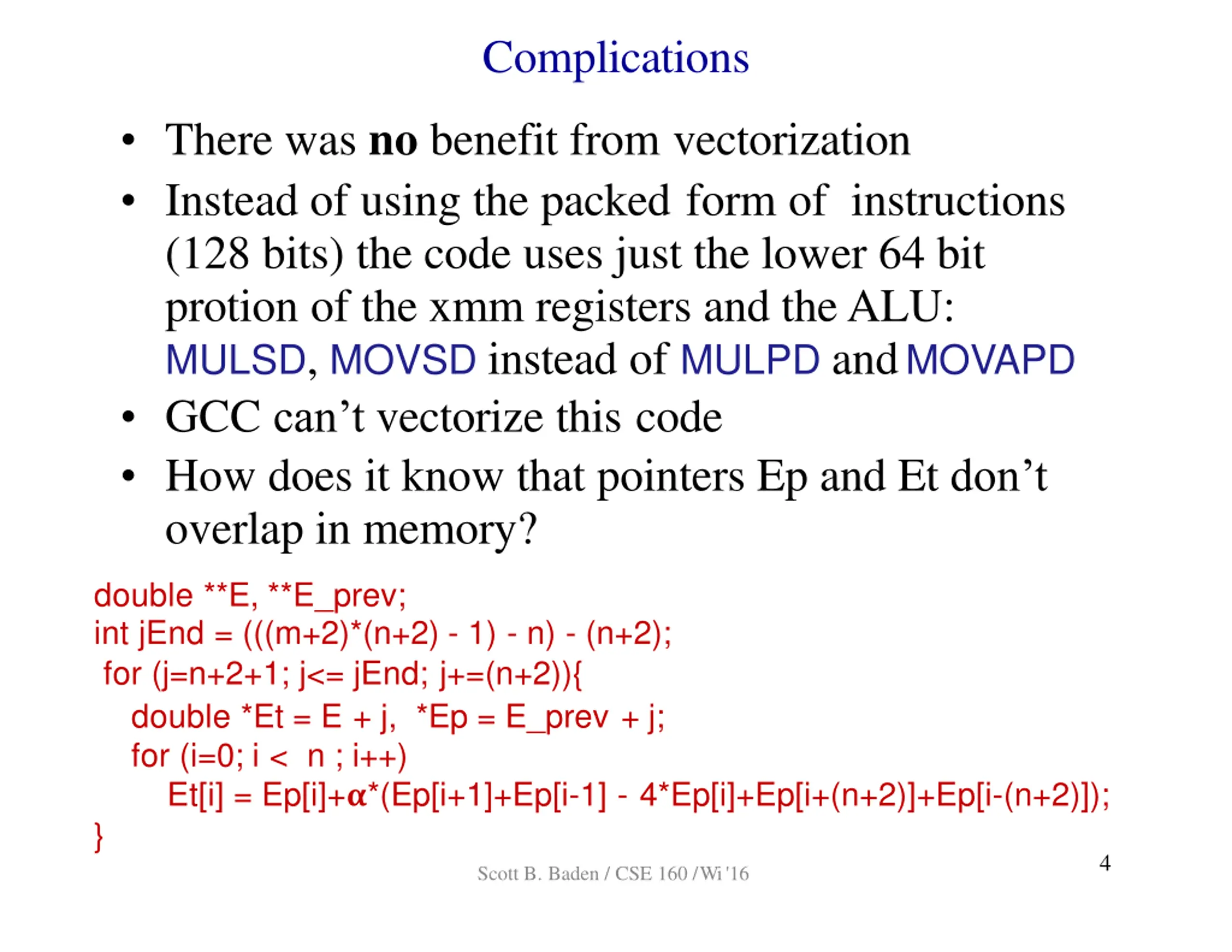 Complications There was no benefit from vectorization Instead of using the packed form of instructions (128 bits) the code uses just the lower 64 bit protion of the xmm registers and the ALU: MULSD, MOVSD instead of MULPD andMOVAPD GCC can t vectorize this code How does it know that pointers Ep and Et don t overlap in memory? double **E, **E_prev; int jEnd = (((m+2)*(n+2) - 1) - n) - (n+2); for (j=n+2+1; j<= jEnd; j+=(n+2)){ double *Et = E + j, *Ep = E_prev + j; for (i=0; i < n ; i++) Et[i] = Ep[i]+?*(Ep[i+1]+Ep[i-1] - 4*Ep[i]+Ep[i+(n+2)]+Ep[i-(n+2)]); } 4 Scott B. Baden / CSE 160 /Wi '16