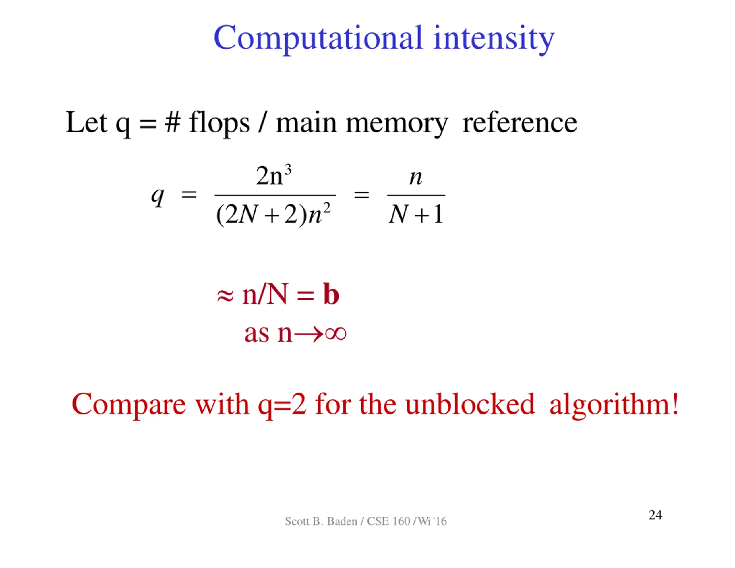 Computational intensity Let q = # flops / main memory reference 2n3 n q = = (2N +2)n2 N +1 n/N = b as n Compare with q=2 for the unblocked algorithm! 24 Scott B. Baden / CSE 160 /Wi '16