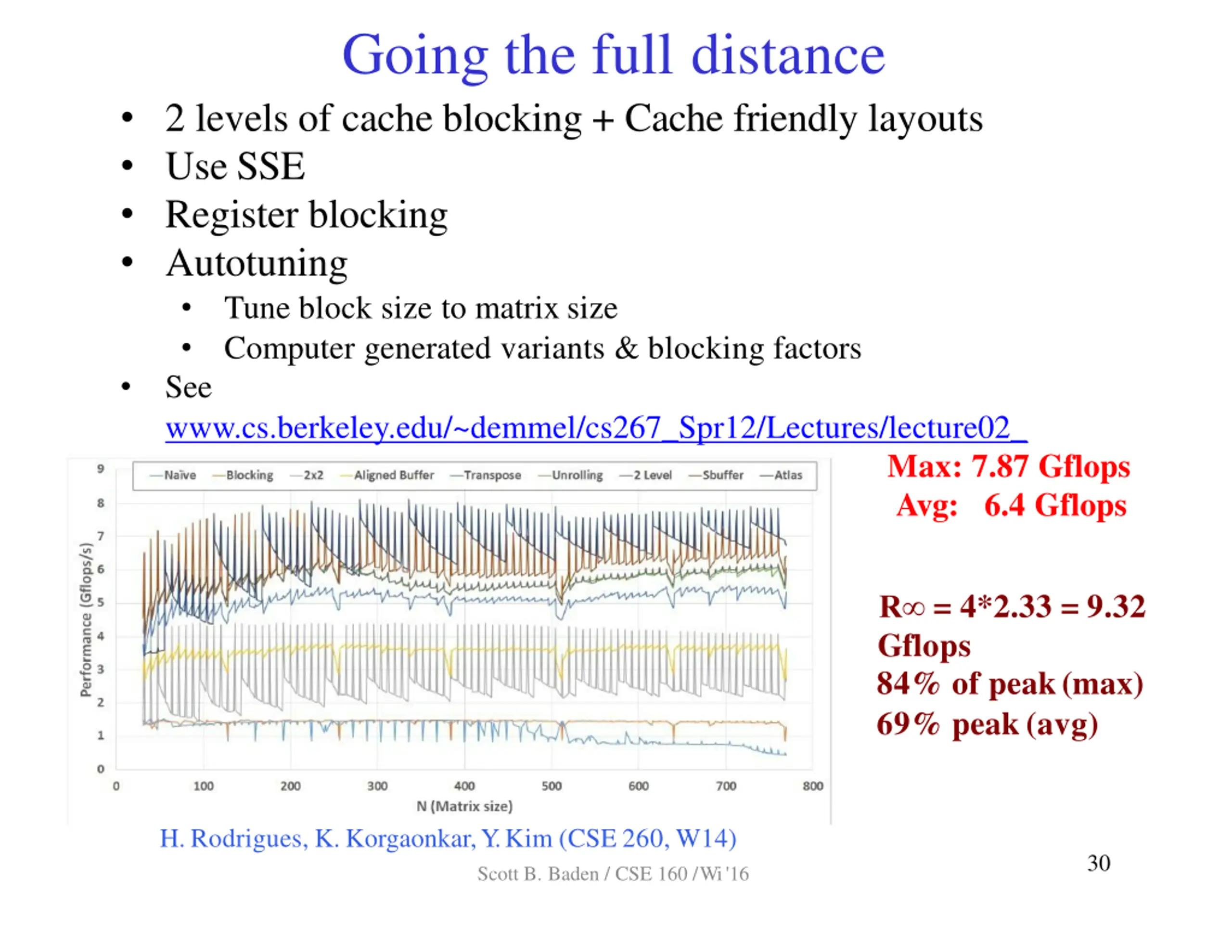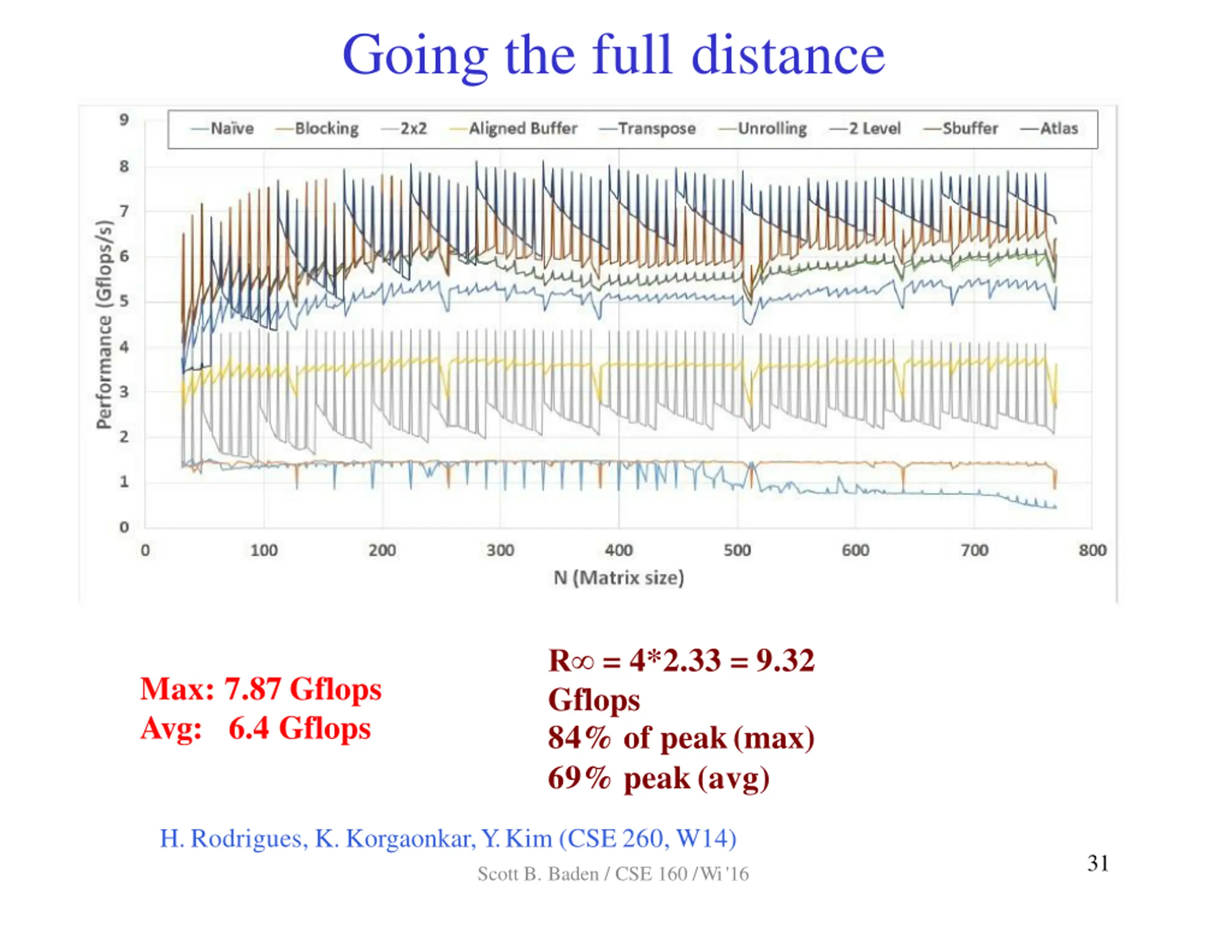 Going the full distance 2 levels of cache blocking + Cache friendly layouts Use SSE Register blocking Autotuning Tune block size to matrix size Computer generated variants & blocking factors See www.cs.berkeley.edu/~demmel/cs267_Spr12/Lectures/lecture02_ memhier_jwd12.ppt Max: 7.87 Gflops Avg: 6.4 Gflops R = 4*2.33 = 9.32 Gflops 84% of peak(max) 69% peak(avg) H.Rodrigues, K.Korgaonkar,Y.Kim (CSE 260, W14) 30 Scott B. Baden / CSE 160 /Wi '16
