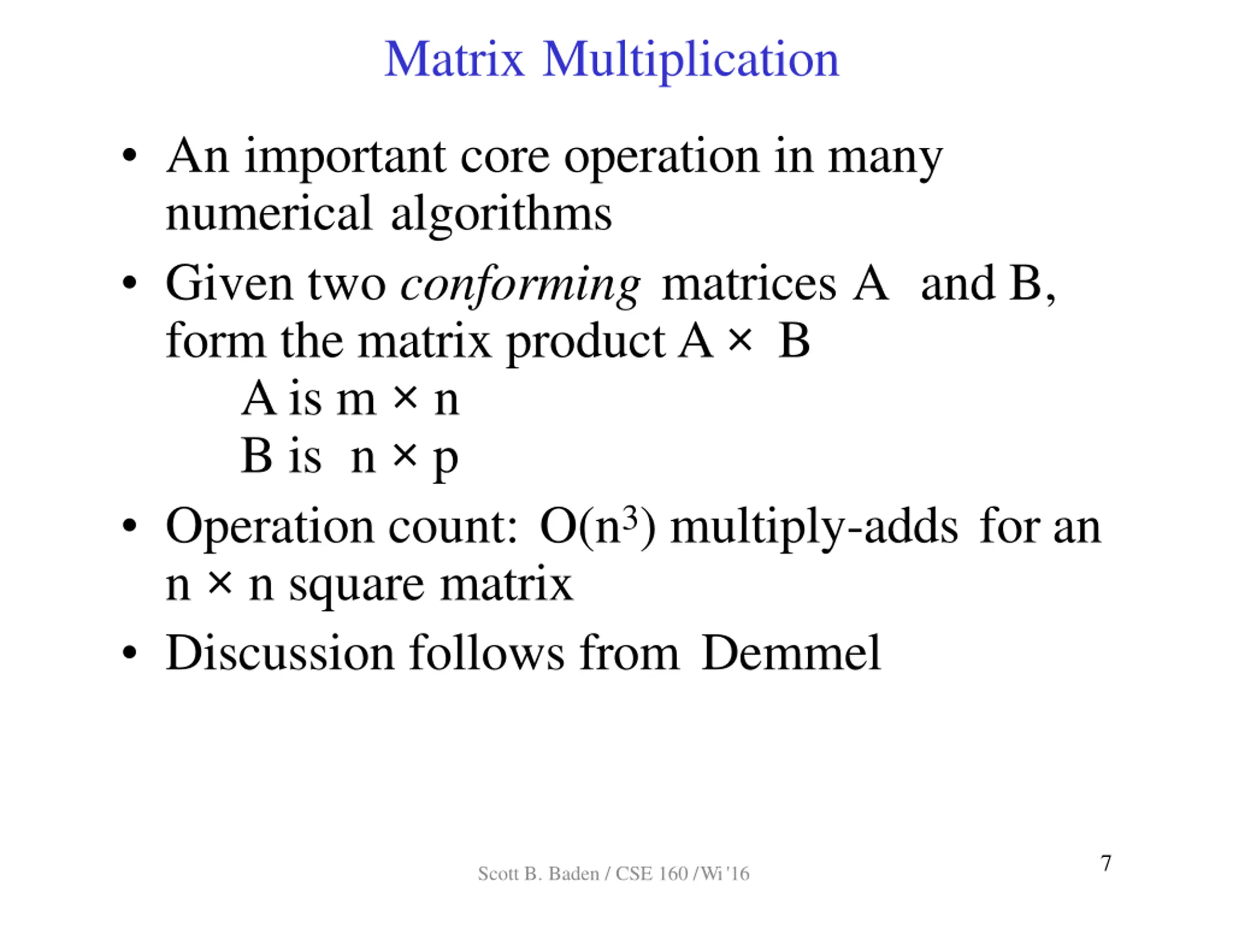 Matrix Multiplication An important core operation in many numerical algorithms Given two conforming matrices A and B, form the matrix product A B A is m n B is n p Operation count: O(n3) multiply-adds for an n n square matrix Discussion follows from Demmel 7 Scott B. Baden / CSE 160 /Wi '16