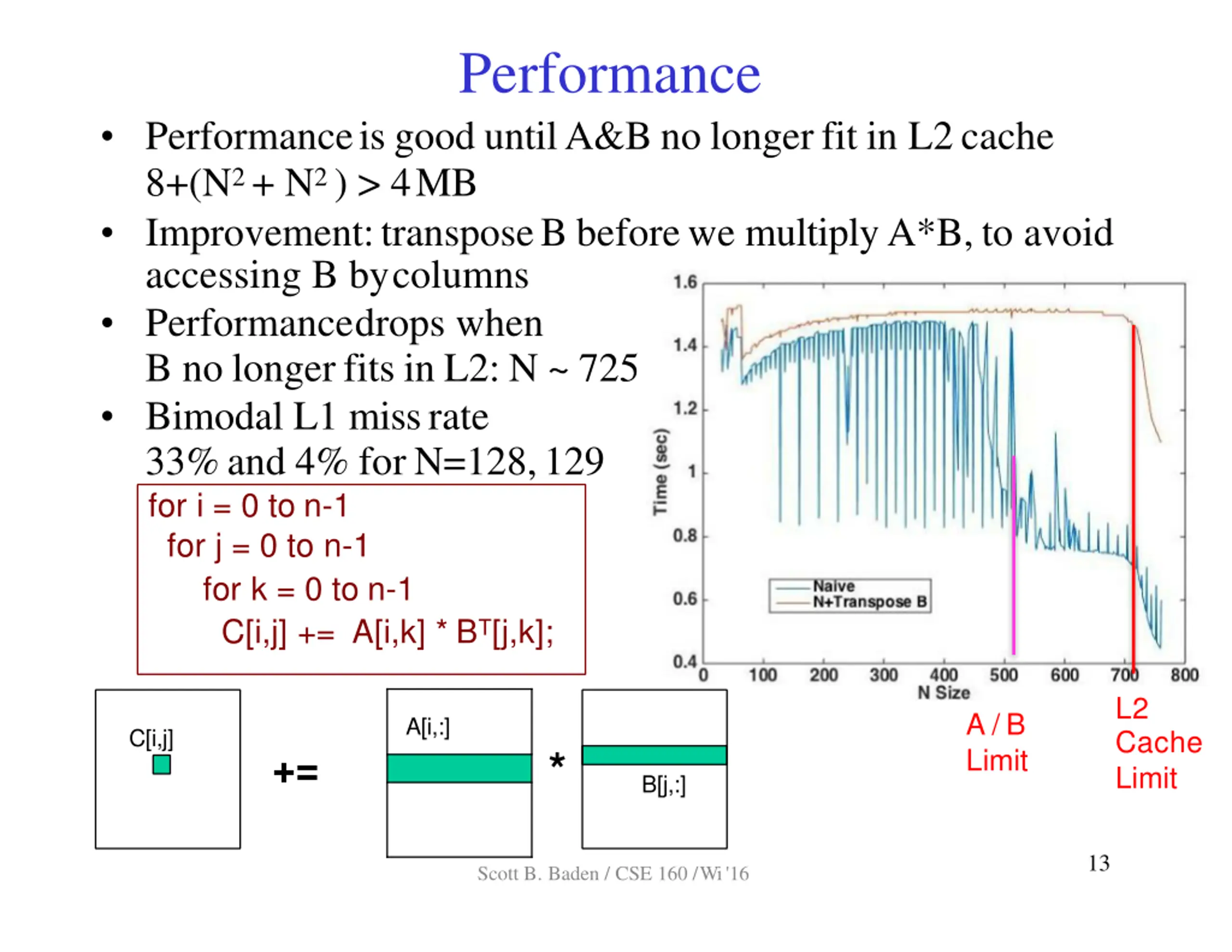 Analysis of performance for i = 0 to n-1 // n n2 / L loads = n3/L, L=cache line size for j = 0 to n-1 // n2 / L loads = n2/L // n2 / L loads + n2 / L stores = 2n2 /L for k = 0 to n-1 C[i,j] += A[i,k] *B[k,j] B[:,:] A[i,:] C[i,j] Total:(n3 + 3n2) /L A[i,:] C[i,j] B[:,j] += * 12 Scott B. Baden / CSE 160 /Wi '16